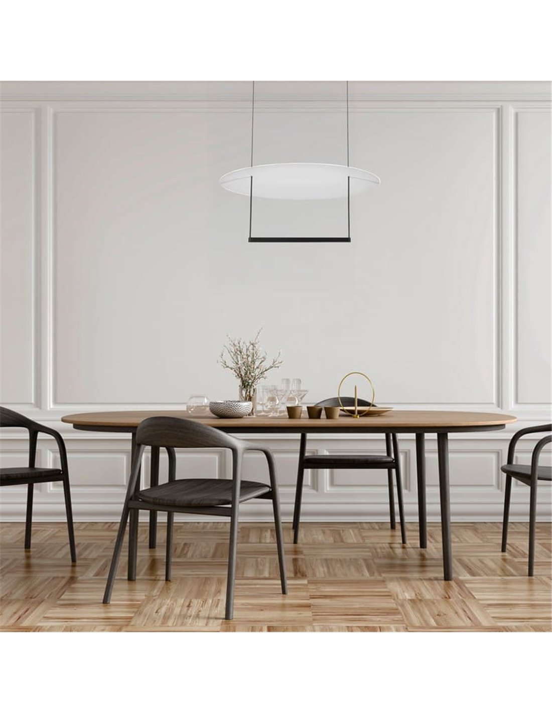 Le modèle SUN II 9423 allie design minimaliste, lumière chaude et haute efficacité lumineuse. Son diffuseur de 60 cm de diamètre offre un éclairage enveloppant, idéal pour les pièces spacieuses comme les salons ou salles à manger modernes.