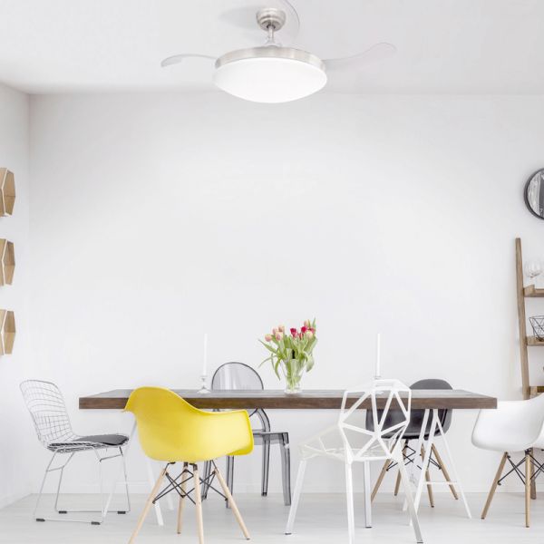 Les pales de ce ventilateur sont transparentes et rétractables, ce qui permet de les dissimuler pour gagner en élégance lorsque le ventilateur n'est pas en marche. De même, il permet une installation sur des plafonds inclinés, avec une inclinaison maximale de 15º, qui s'adapte à pratiquement n'importe quelle maison.