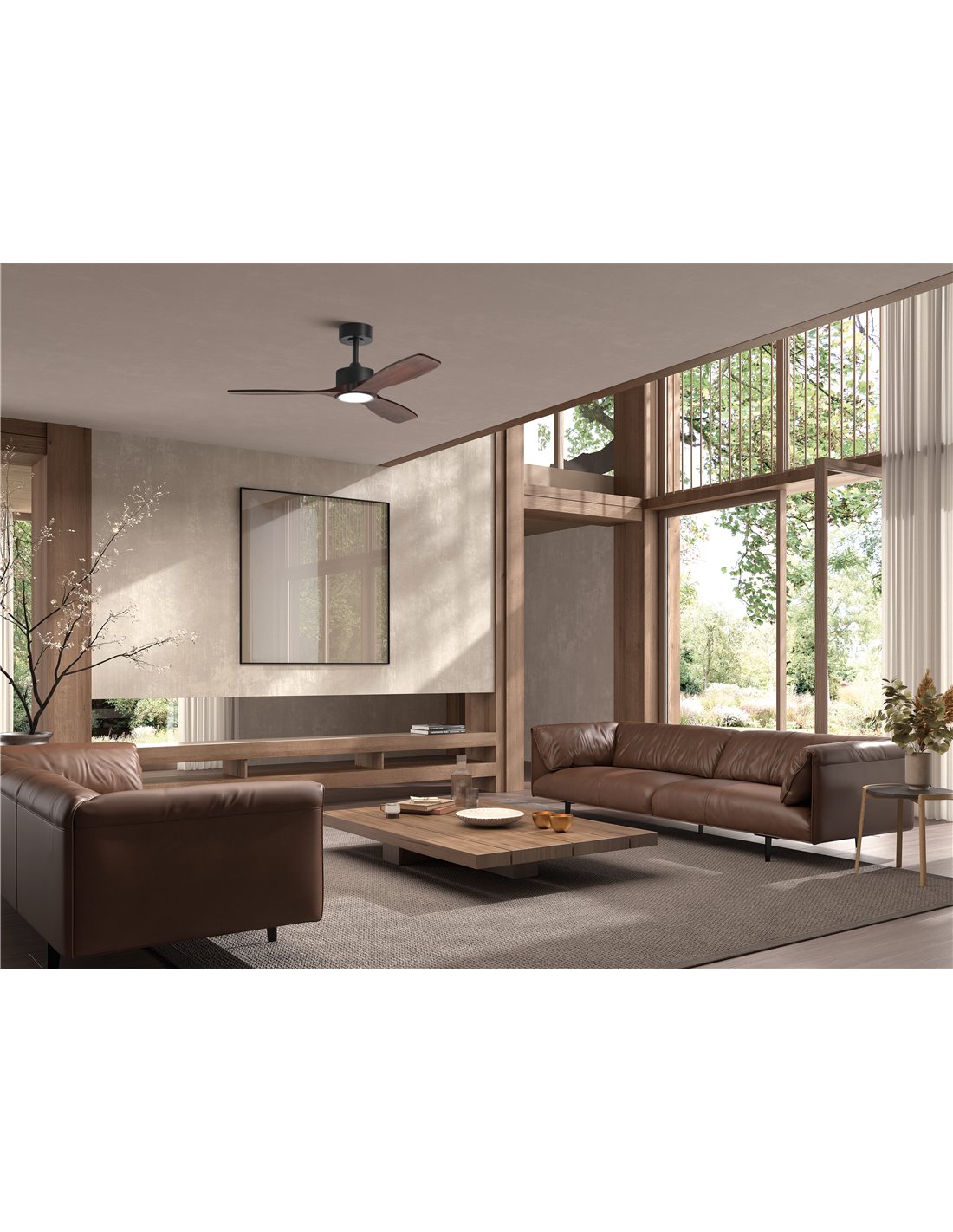Ventilateur de plafond LED SANTORINI XS noir et noyer avec moteur à courant continu et lumière CCT à intensité variable