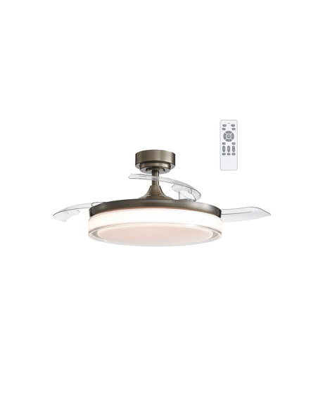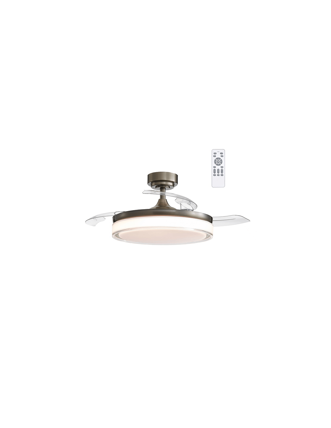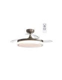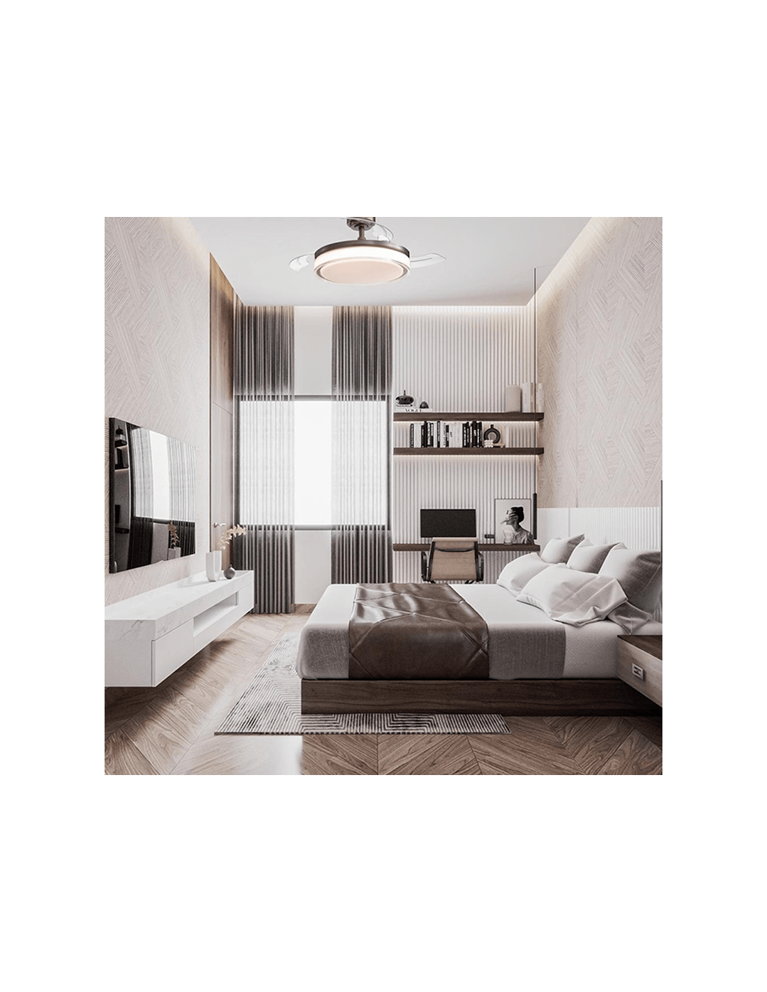 Les pales du ventilateur Aneto LED en finition cuir sont rétractables, ce qui permet d'utiliser le ventilateur comme plafonnier lorsqu'il n'est pas utilisé. Il comprend une télécommande pour contrôler à la fois l'éclairage et la vitesse de rotation et les fonctions du ventilateur : trois températures de couleur, mémoire d'allumage, fonction de rotation inverse (puisqu'elle permet aux pales de tourner dans deux sens) et minuterie ( 2-4h).