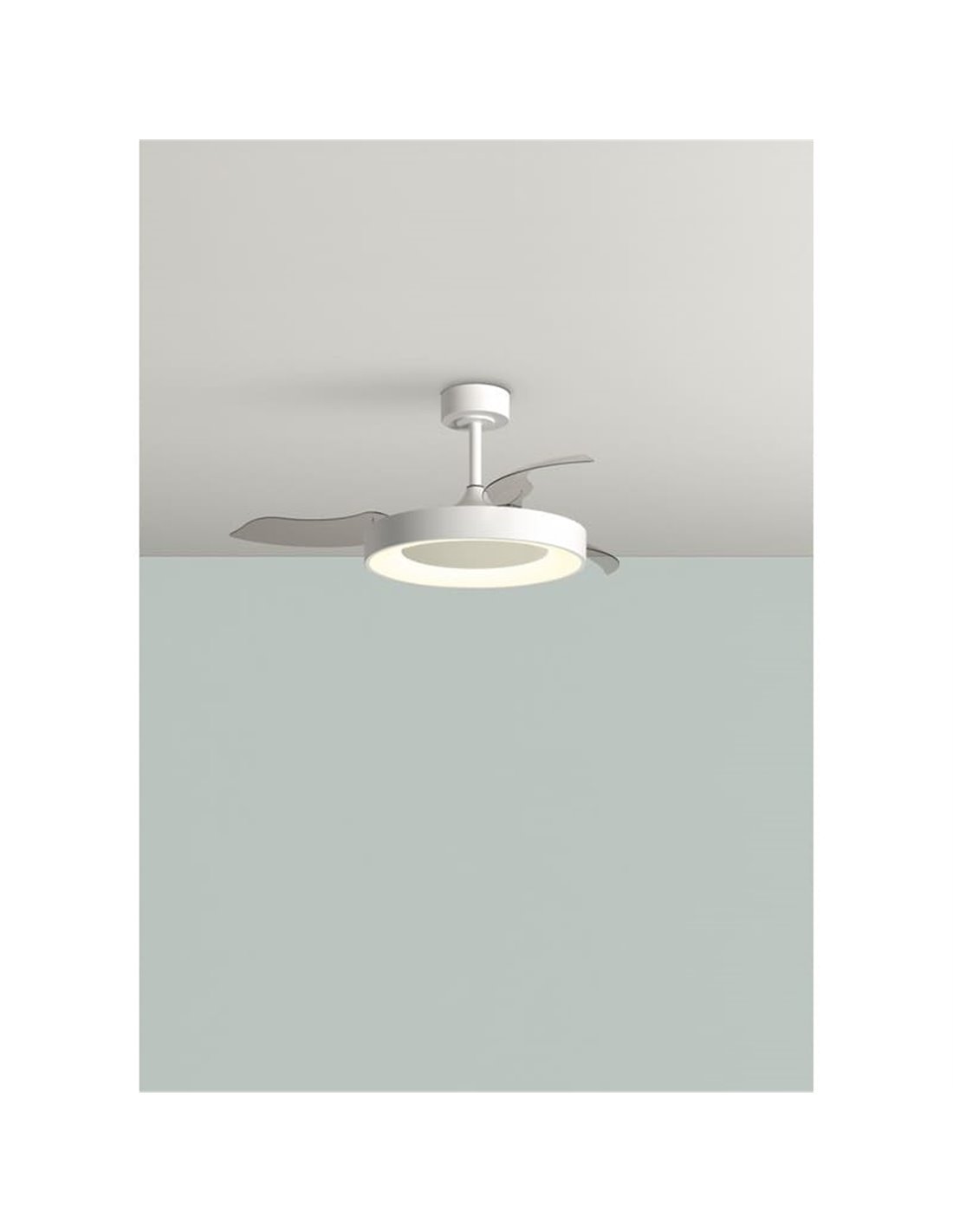 Ventilateur de plafond LED LISBOA à pales rétractables , de couleur blanche , d'un diamètre de Ø1065 mm . Moteur CC 30 W et lumière LED 50 W. Il comprend la fonction CCT (réglage de la température de couleur), une télécommande et est dimmable. Idéal pour une ventilation efficace et un éclairage adaptable dans n’importe quel espace intérieur.