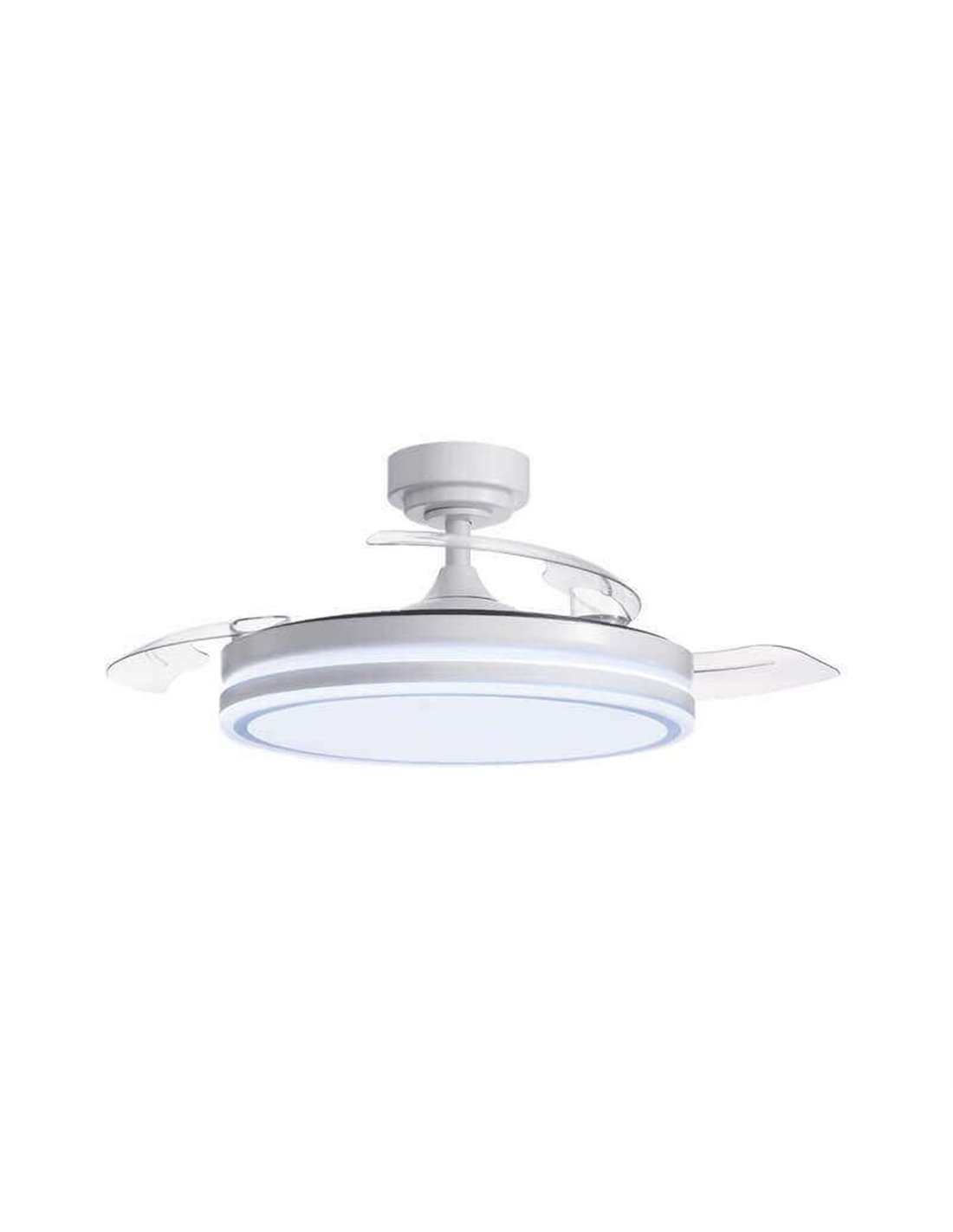Ventilateur de plafond Moss LED à pales rétractables . Ventilateur blanc moderne au design pratique qui permet à la fois d'assurer la ventilation et d'éclairer la pièce. Il dispose d'un éclairage LED intégré, réglable en intensité lumineuse et en trois températures de couleur (3000-4000-6000K). De plus, avec la télécommande, vous pouvez sélectionner la fonction brise, un mode veilleuse ou régler le ventilateur pour qu'il s'éteigne après 2 à 4 heures. Moteur DC ultra silencieux avec six vitesses de rotation et fonction d'inversion hiver-été. Ventilateur blanc à pales transparentes.
