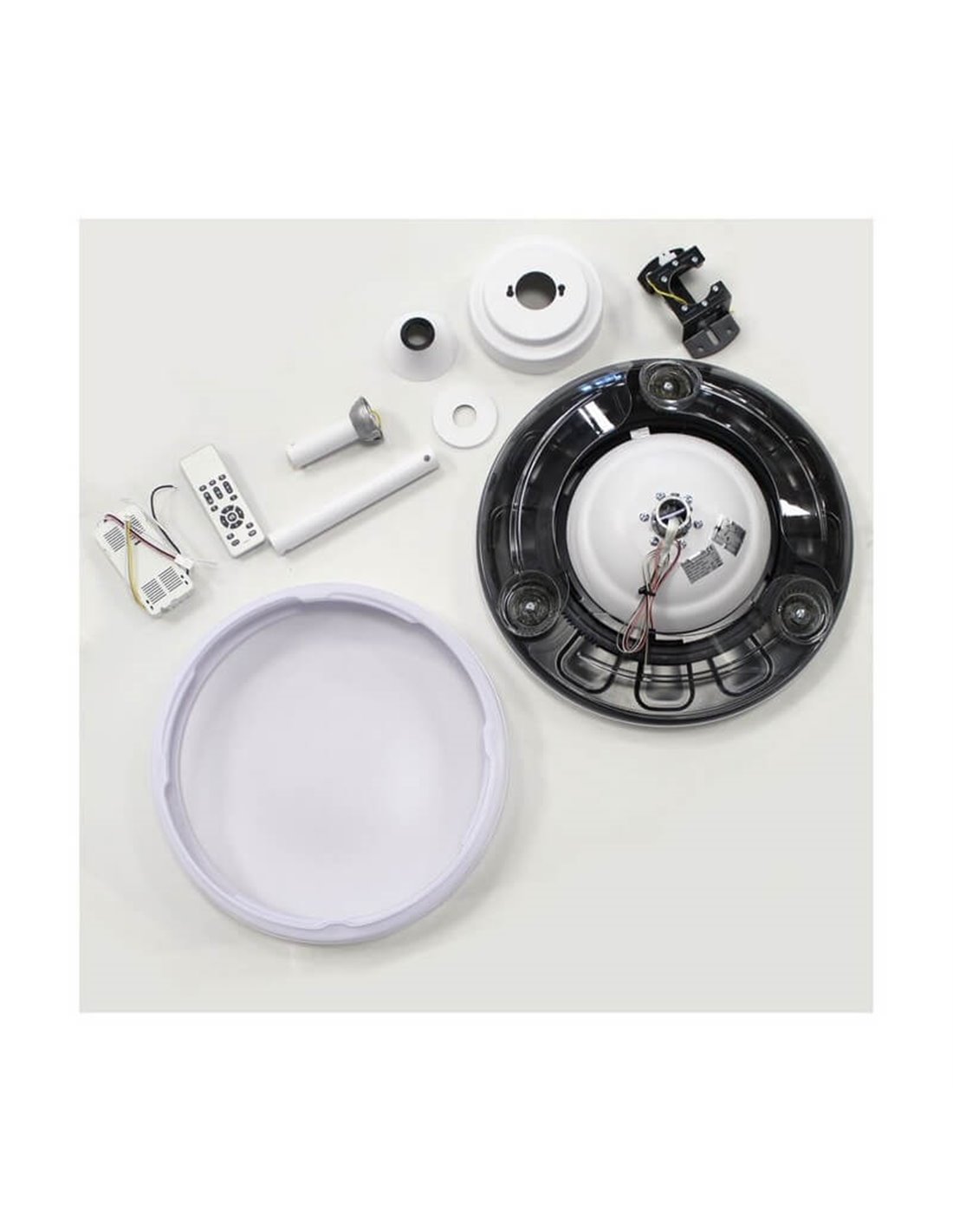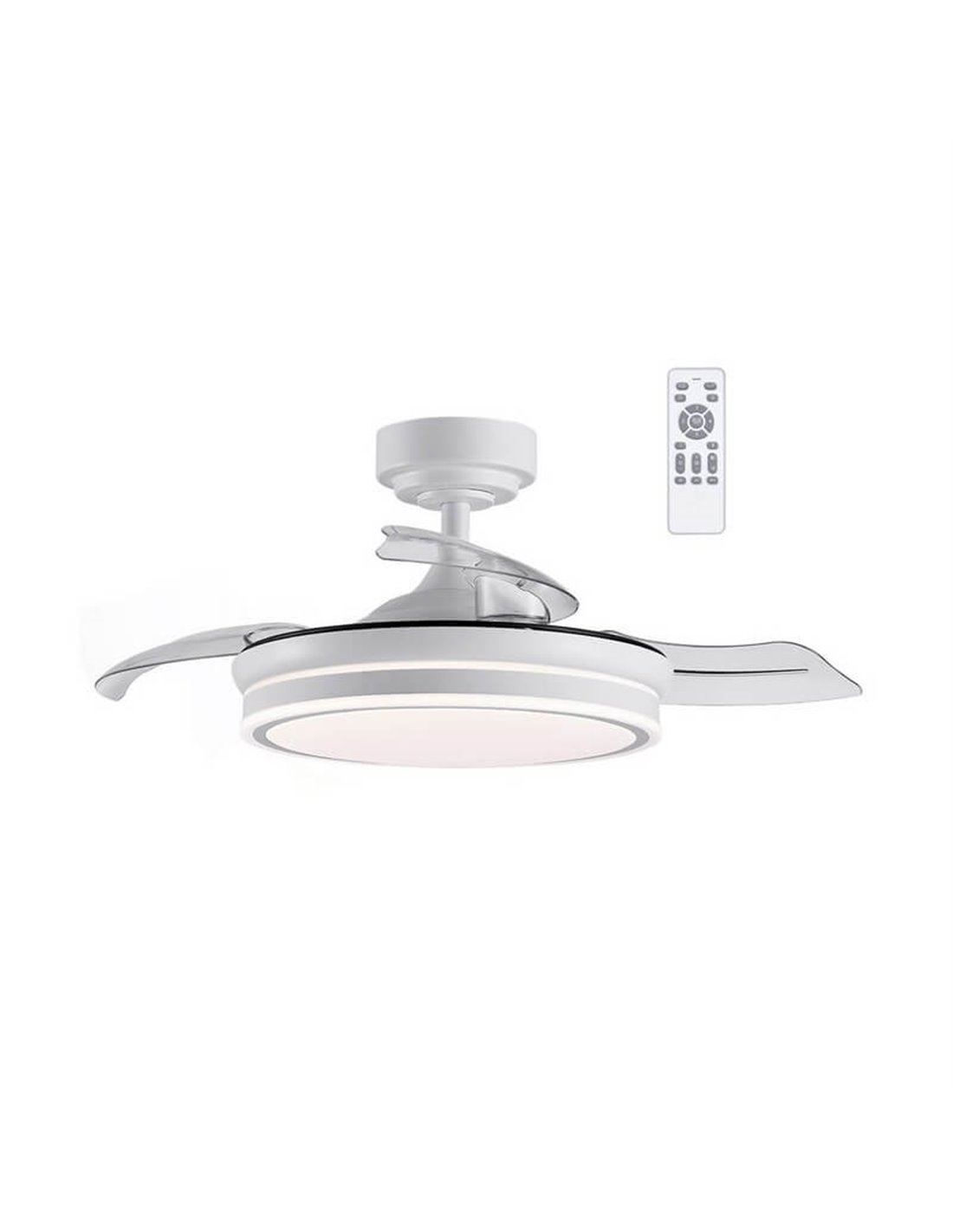Ventilateur de plafond Mini Moss LED pour petites pièces . Ventilateur de plafond à pales rétractables conçu pour assurer la circulation de l'air et l'éclairage dans les chambres et les petits salons. Il dispose d'un moteur ultra silencieux avec 6 vitesses de rotation, fonction marche arrière hiver-été, minuterie et fonction brise. Quant à l'éclairage, vous pouvez définir trois tons d'éclairage (chaud, neutre ou froid) et diminuer l'intensité lumineuse. Le corps du ventilateur est blanc et les pales repliables sont transparentes.