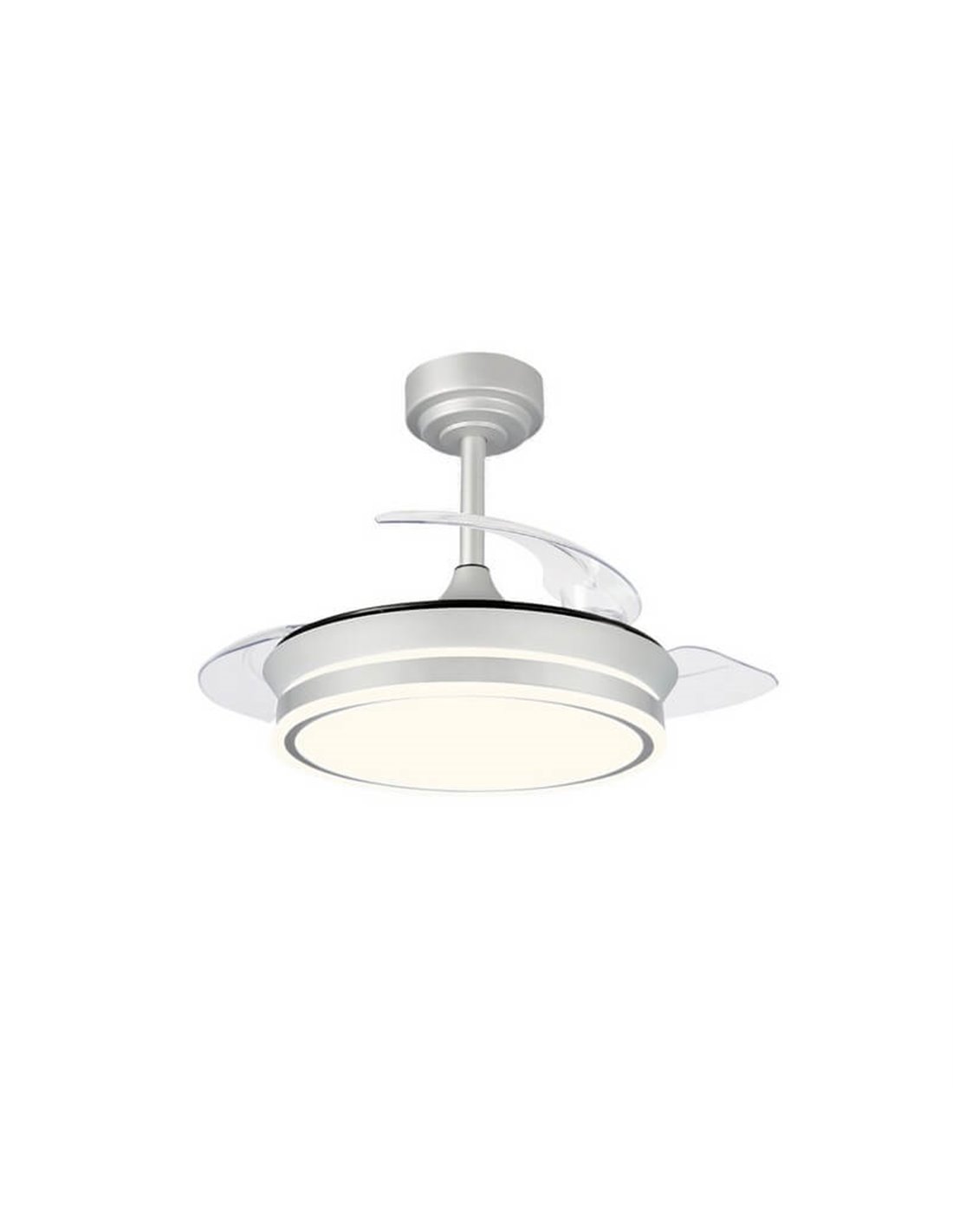 Ventilateur de plafond Mini Moss LED pour petites pièces . Ventilateur de plafond à pales rétractables conçu pour assurer la circulation de l'air et l'éclairage dans les chambres et les petits salons. Il dispose d'un moteur ultra silencieux à 6 vitesses, d'une fonction d'inversion hiver-été, d'une minuterie et d'une fonction brise. Quant à l'éclairage, vous pouvez définir trois tons d'éclairage (chaud, neutre ou froid) et diminuer l'intensité lumineuse. Le corps du ventilateur est gris et les pales repliables sont transparentes.
