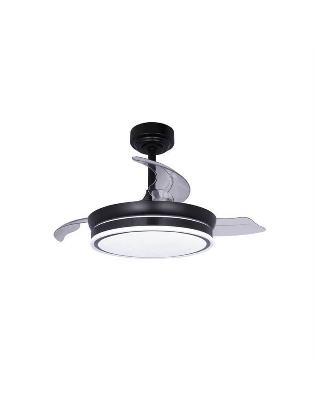 Ventilateur de plafond Mini Moss LED pour petites pièces . Ventilateur de plafond à pales rétractables conçu pour assurer la circulation de l'air et l'éclairage dans les chambres et les petits salons. Il dispose d'un moteur ultra silencieux à 6 vitesses, d'une fonction d'inversion hiver-été, d'une minuterie et d'une fonction brise. Quant à l'éclairage, vous pouvez définir trois tons d'éclairage (chaud, neutre ou froid) et diminuer l'intensité lumineuse. Le corps du ventilateur est noir et les pales repliables sont transparentes.