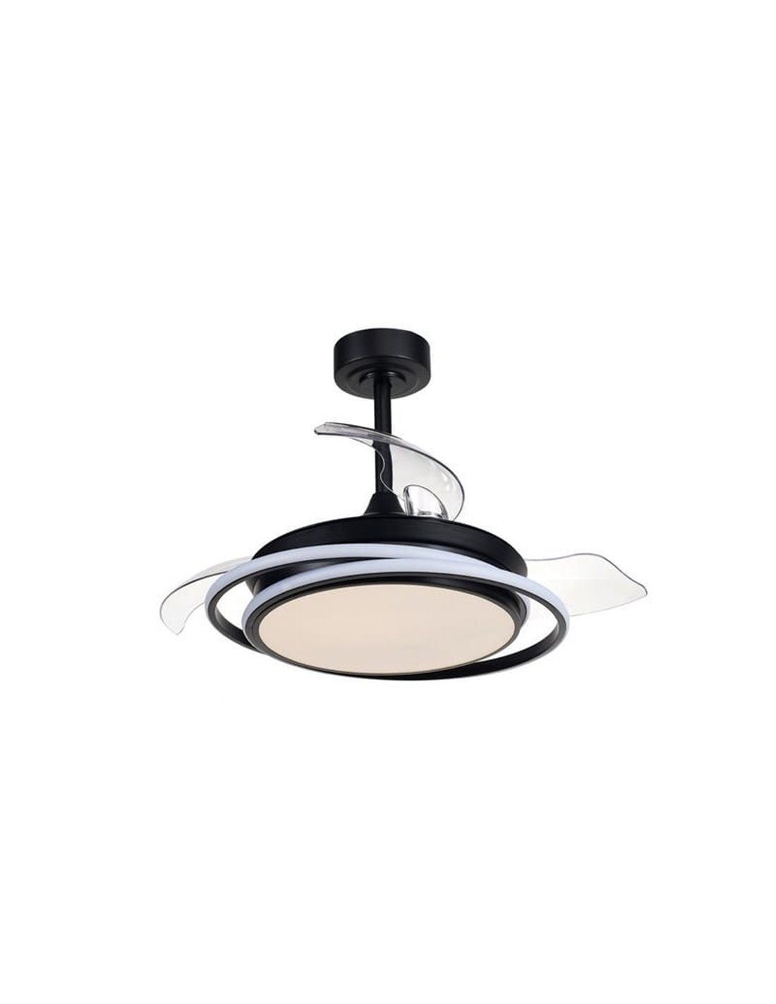 Le ventilateur de plafond LED noir ANTILA MINI de CristalRecord est le choix idéal pour ceux qui recherchent une solution compacte, efficace et élégante pour les chambres, les petits salons ou les bureaux. Sa finition noire mate et ses lames pliables en font une pièce décorative élégante même lorsqu'il est éteint.