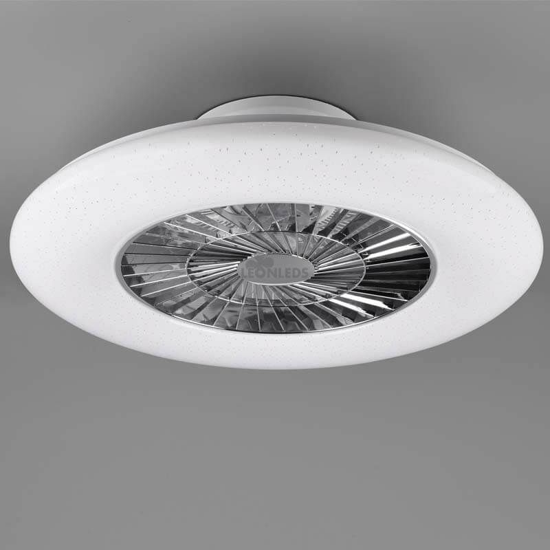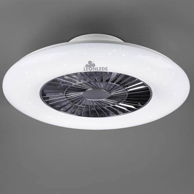 Le ventilateur de plafond LED avec commande chromée de la série Visby par Trio Lighting, un ventilateur silencieux qui peut être contrôlé avec sa télécommande, (Incluse) et permet de régler à la fois l'intensité lumineuse et la tonalité lumineuse. Il a un moteur à courant alternatif et 7 pales en ABS, sa structure en métal de couleur chrome qui cache les pales et à l'extérieur on retrouve le diffuseur de lumière qui offre un effet de lueur semblable aux étoiles. Le ventilateur offre 3 vitesses de régulation et à puissance minimale il ne génère que 45 décibels avec une consommation de seulement 40W.