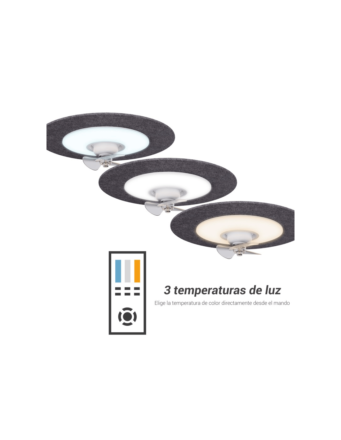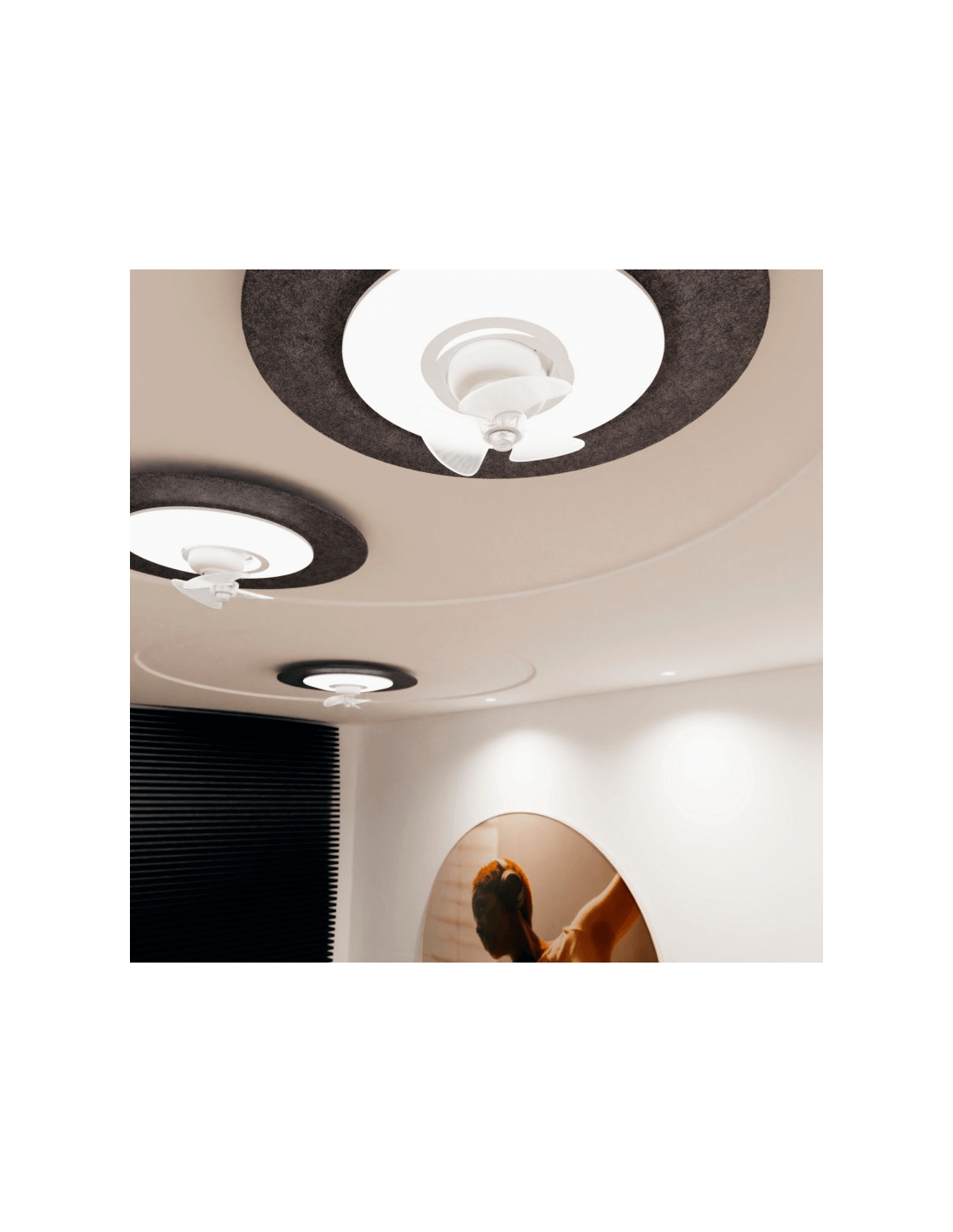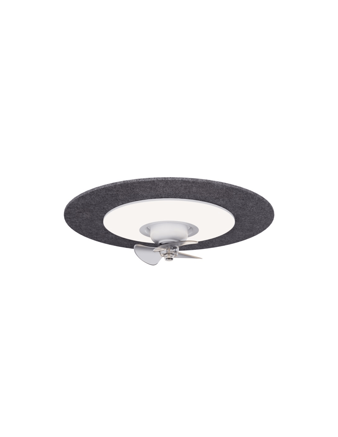 Le ventilateur de plafond FONO intègre un écran acoustique constitué d'un matériau insonorisant qui minimise le rebond du son et réduit donc le bruit ambiant et le bruit de l'air lui-même créé par les trois pales ABS , même à vitesse maximale.