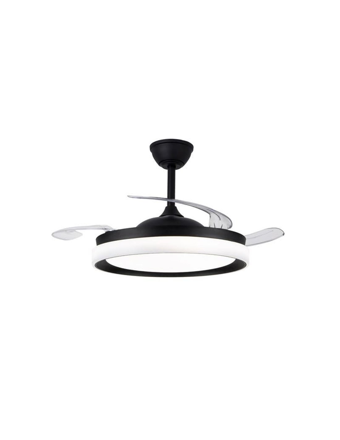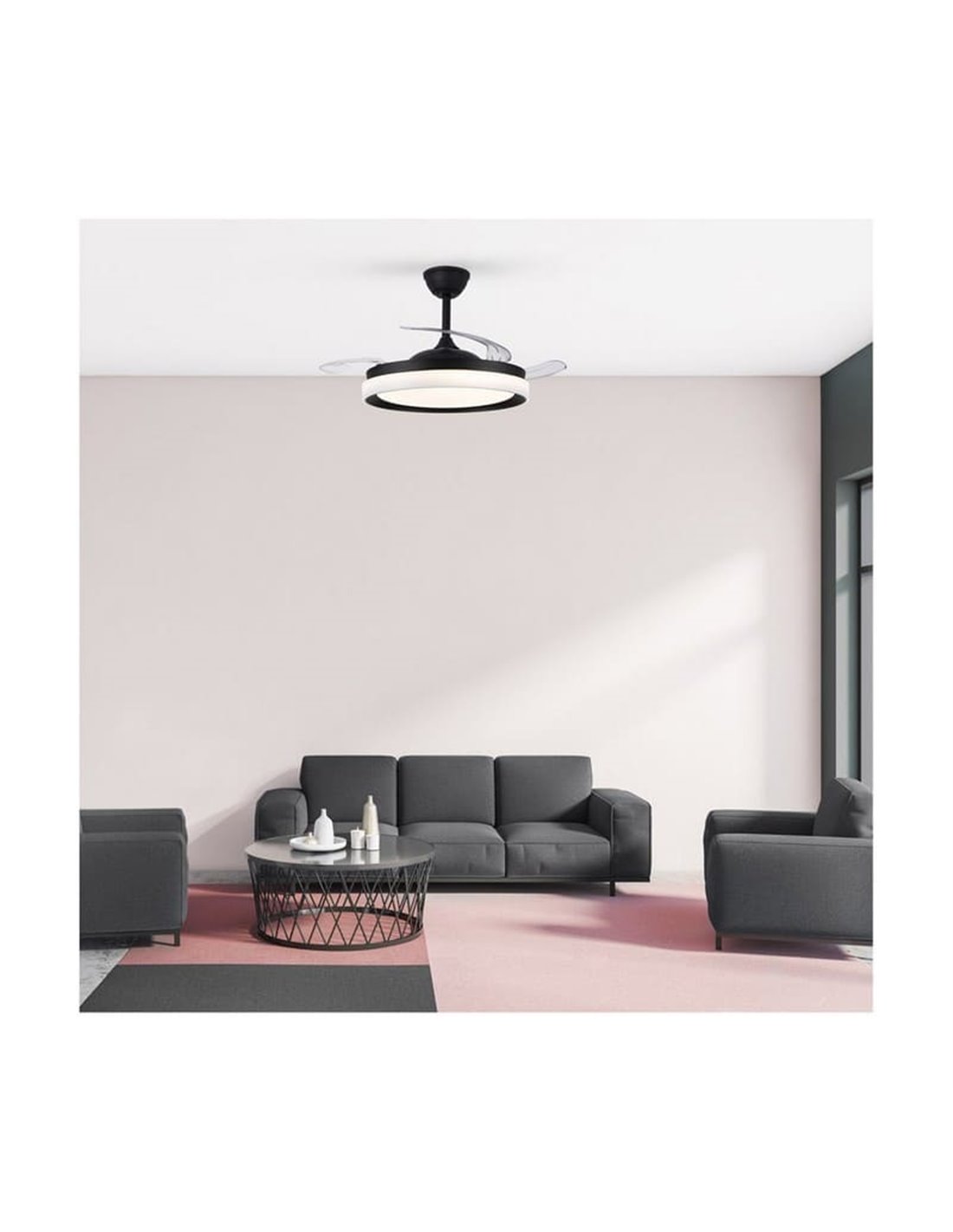 Le ventilateur de plafond LED noir BRISA ECO est une solution élégante qui combine un éclairage et une ventilation efficaces dans un design moderne avec des pales rétractables . Ces pales se déploient lorsque le ventilateur est allumé et se rétractent lorsqu'il est éteint, offrant une esthétique épurée et sophistiquée.