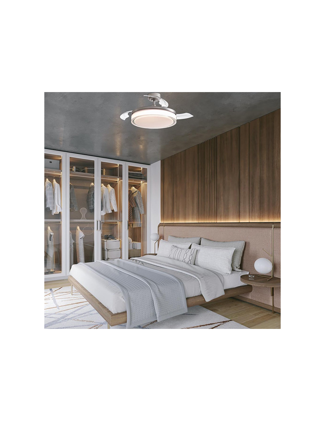 Les pales du ventilateur Aneto sont rétractables , ce qui permet d'utiliser le ventilateur comme plafonnier lorsqu'il n'est pas utilisé.