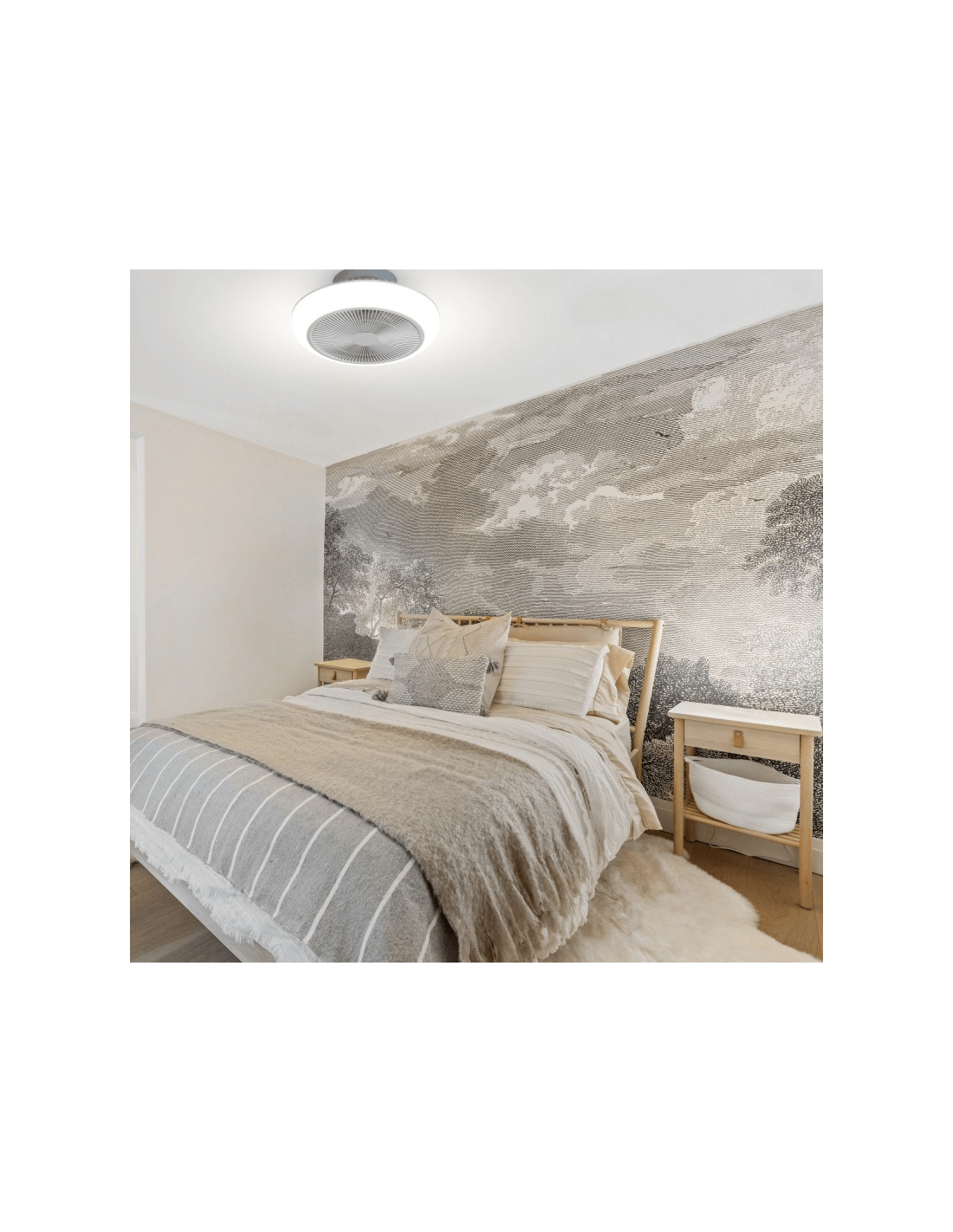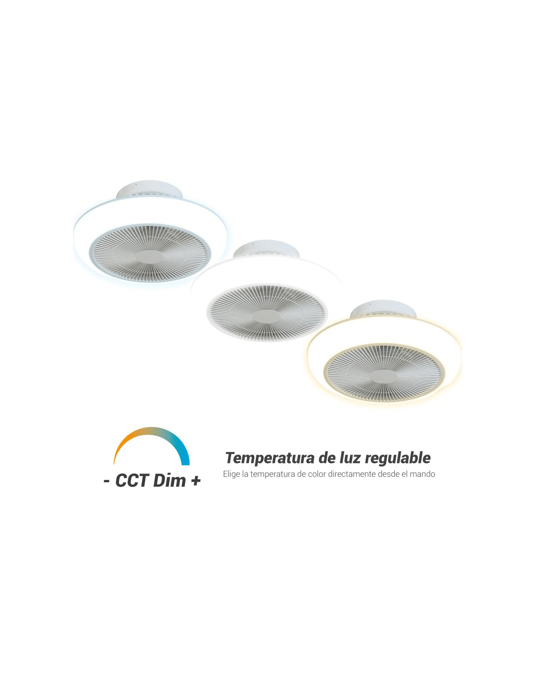 Découvrez le nouveau design de type plafonnier d'Enkel basé sur un luminaire avec un ventilateur intégré au centre et 5 pales transparentes en ABS. Sa caractéristique la plus remarquable est sa source lumineuse très efficace, qui a la capacité d'être régulée à la fois en température de couleur ( chaud, froid et naturel ) et en intensité. Il a les dimensions suivantes : un diamètre de 455 mm et une hauteur de 200 mm pour un poids de 2,3 kg.
