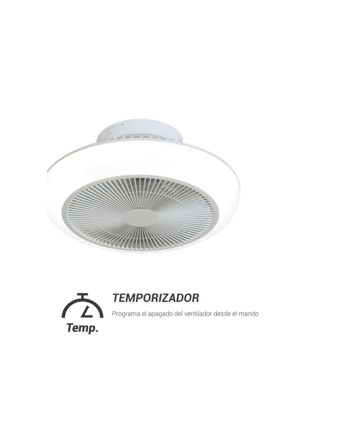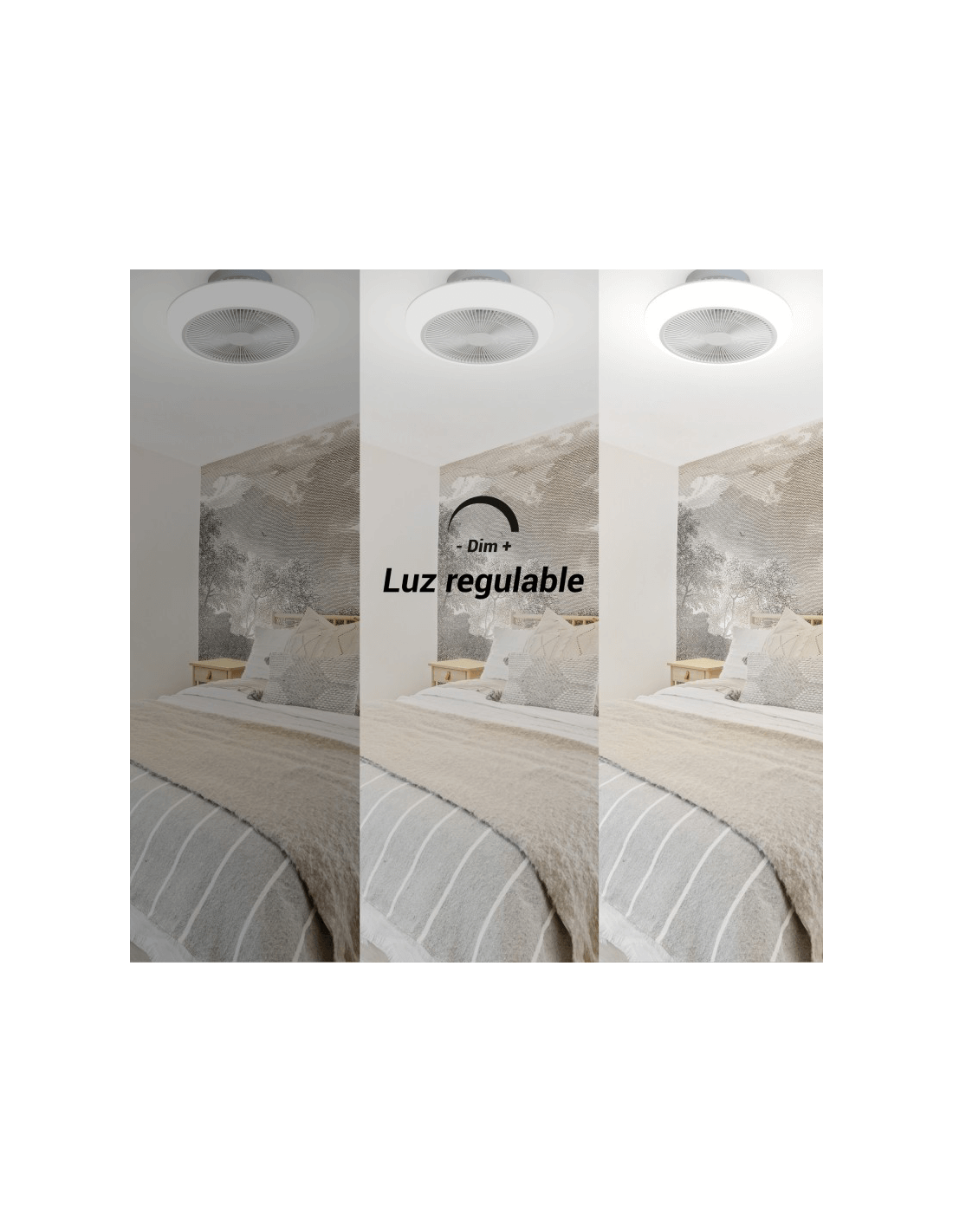 Il dispose également d'une fonction été-hiver qui vous permet d'inverser le sens de rotation des pales de notre ventilateur afin que vous puissiez profiter du ventilateur pendant les mois les plus chauds ou les plus froids. Il a également une minuterie et naturwind. Il est idéal pour les petits studios ou les espaces qui nécessitent un grand éclairage jusqu'à 13m2 (chambres, bureaux ou cuisines) puisqu'il a une température de couleur de 3000 (chaud) à 6000 K (froid) avec un flux de 4400 lumens avec une puissance 44W maximale .