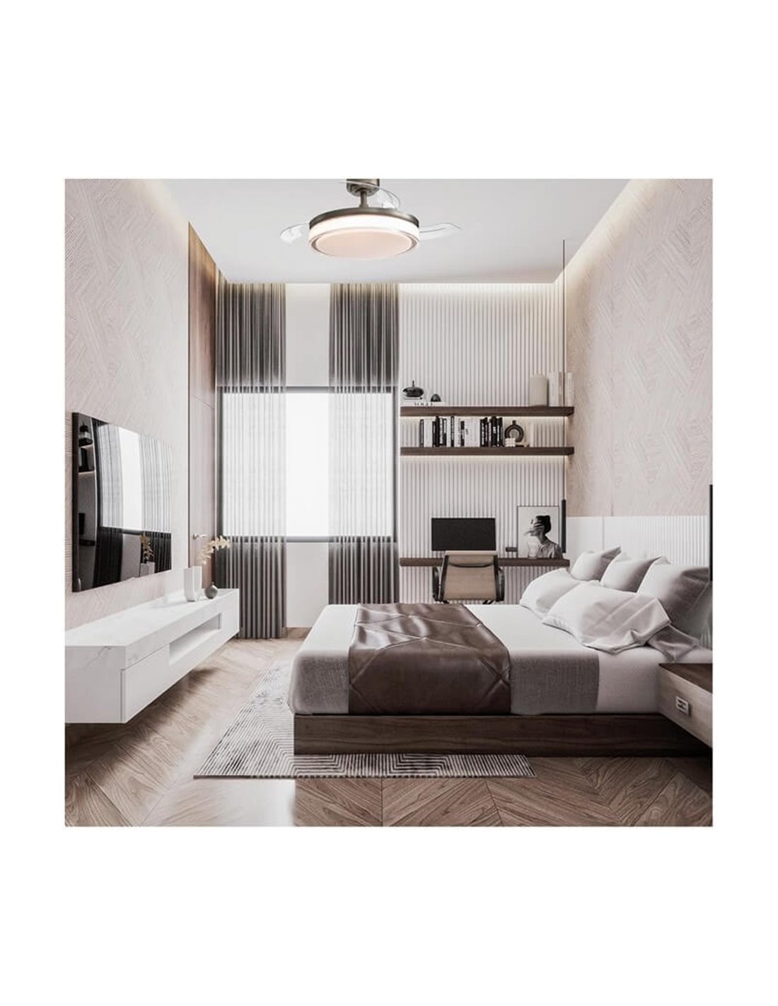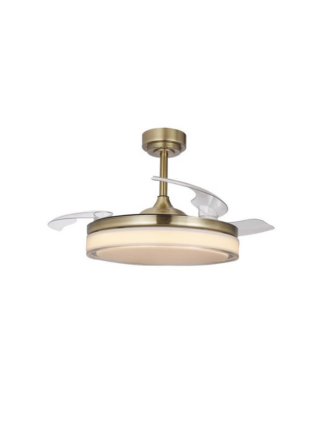 Ventilateur de plafond Aneto à pales rétractables . Offrez un flux d'air suffisant dans votre chambre ou votre salon avec ce ventilateur ultra-silencieux à six vitesses de rotation. Le ventilateur dispose d'une lumière LED intégrée de 72 W qui vous permet de résoudre l'éclairage principal de la pièce. Les pales sont rétractables, permettant au ventilateur d'être utilisé comme plafonnier lorsqu'il n'est pas utilisé. Comprend une télécommande pour contrôler à la fois l'éclairage, la vitesse de rotation et les fonctions du ventilateur. Trois températures de couleur, mémoire de mise sous tension, fonction inverseur et minuterie. Ventilateur de plafond couleur cuir avec pales transparentes.