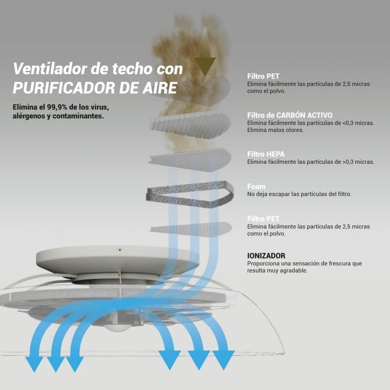 Le changement de température passe du blanc chaud à l'éclairage froid idéal pour les cuisines.Son flux est de 3000 lumens. Cette lampe ventilateur avec purificateur d'air est réglable, ce qui la rend idéale pour créer l'environnement idéal pour chaque occasion. Il implémente également une fonction de mémoire qui mémorise la configuration de l'appareil et possède un niveau d'étanchéité IP20 qui offre une protection contre les corps solides de plus de 12 mm.