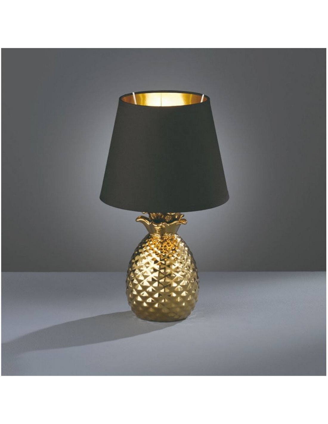 O pequeno candeeiro de mesa PINEAPPLE é um acessório decorativo com personalidade, que adiciona um toque de glamour e aconchego a qualquer canto. A sua base em cerâmica dourada com um design de abacaxi transmite elegância e originalidade, enquanto o abajur em tecido preto com interior dourado cria uma iluminação acolhedora, perfeita para a casa.