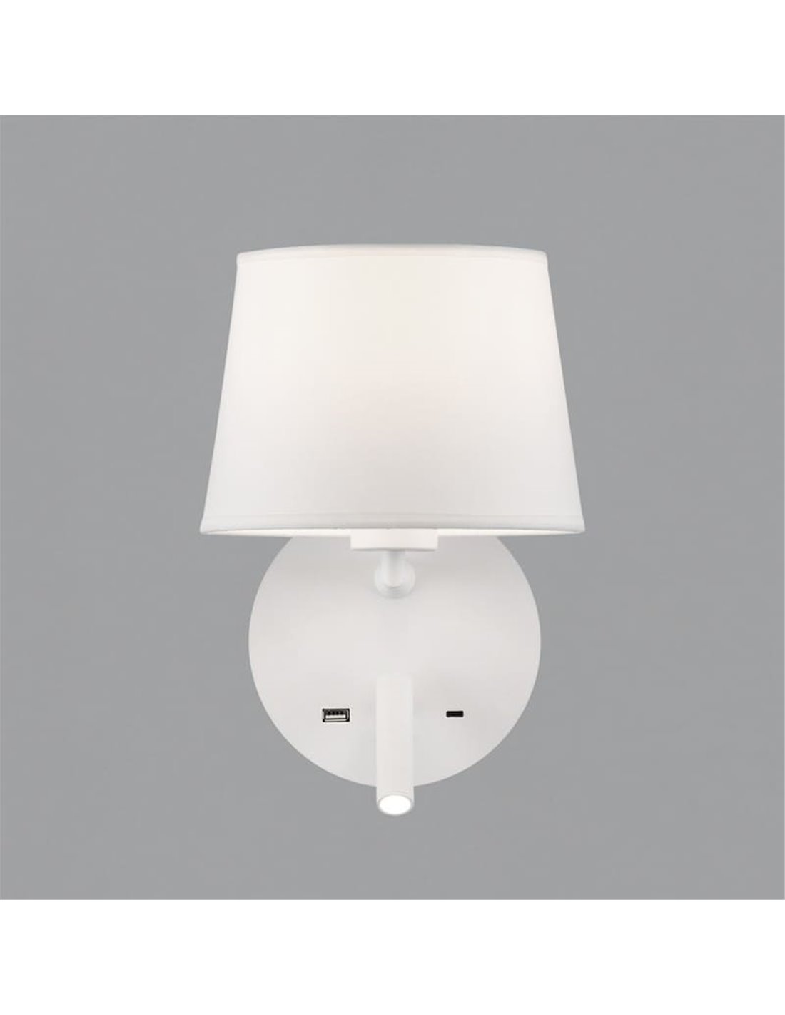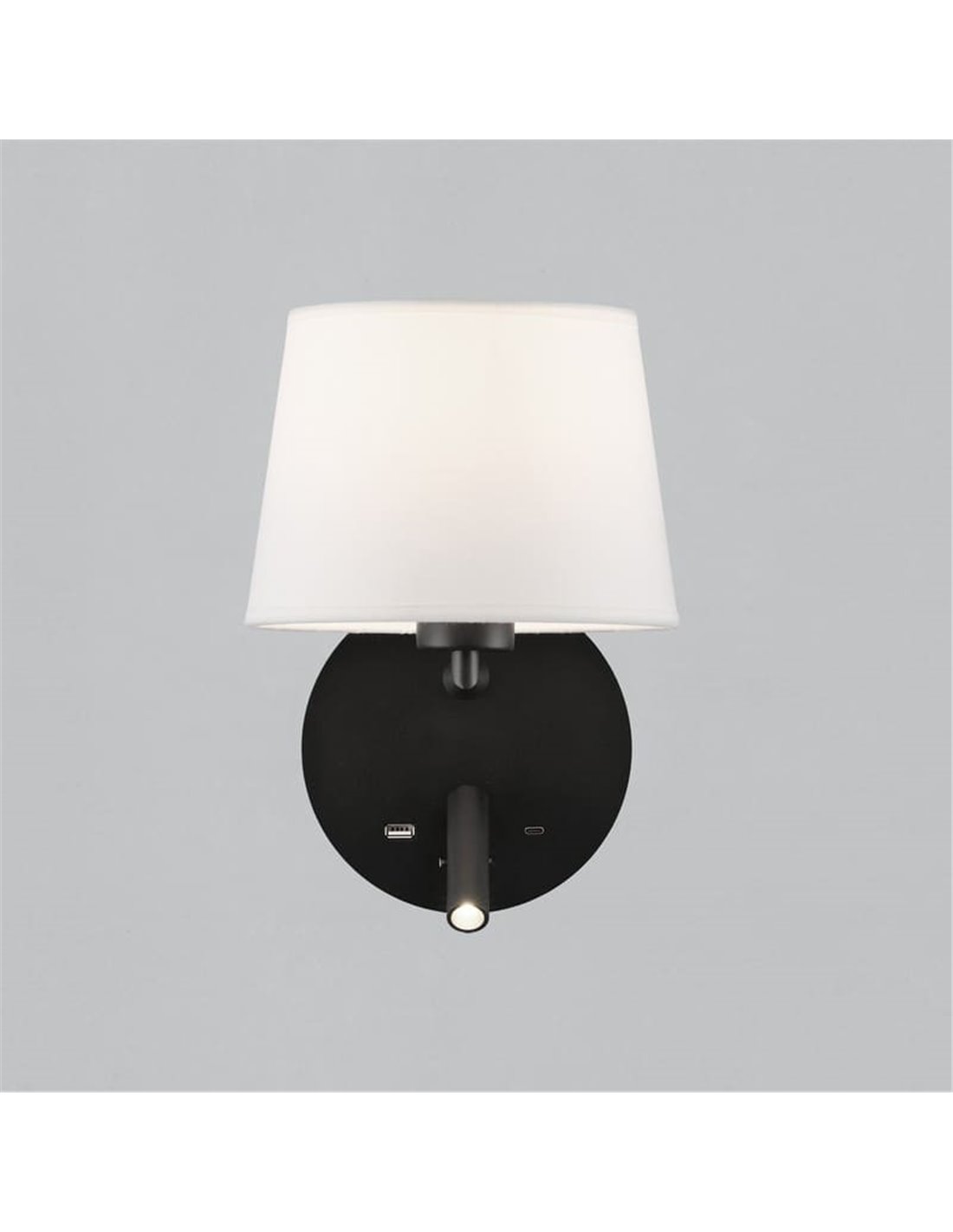 Aplique E27 tela 15W + leitor LED 3W 3000K 285Lm, STILO, branco/preto Texturizado. Inclui porta USB e USBC . Este versátil produto combina iluminação ambiente com um prático leitor LED, ideal para espaços modernos e funcionais.