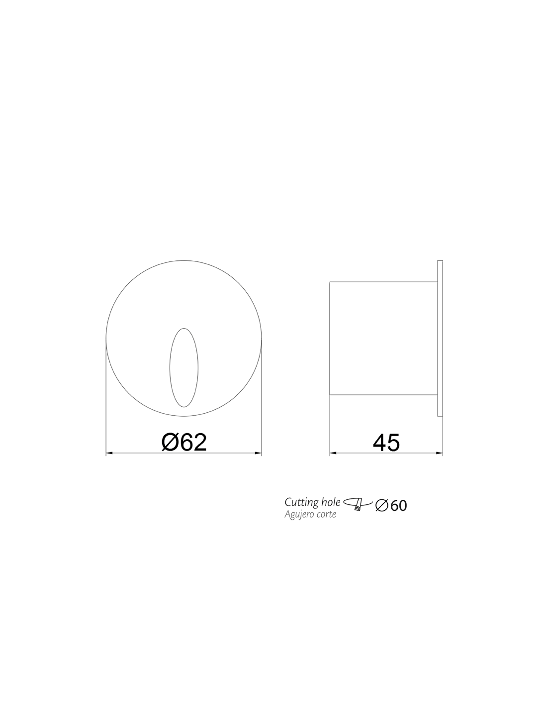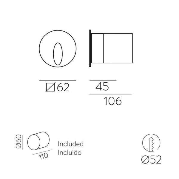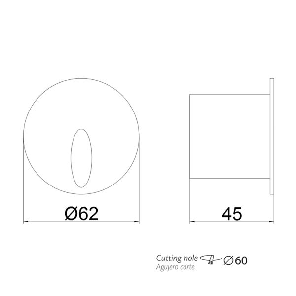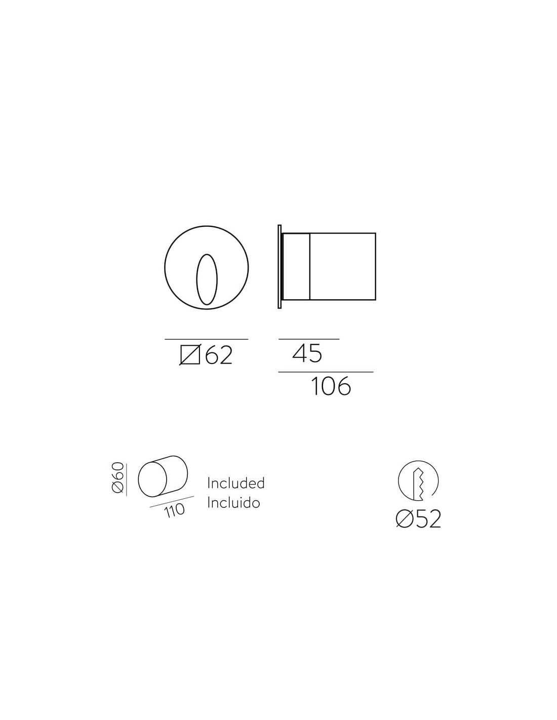 Em relação às dimensões deste produto, destacamos 62 mm de diâmetro e oferece um ângulo de feixe de luz de 50º, além do nível de classificação IP65 e IK06 , são protegidos contra entrada de poeira e contato.