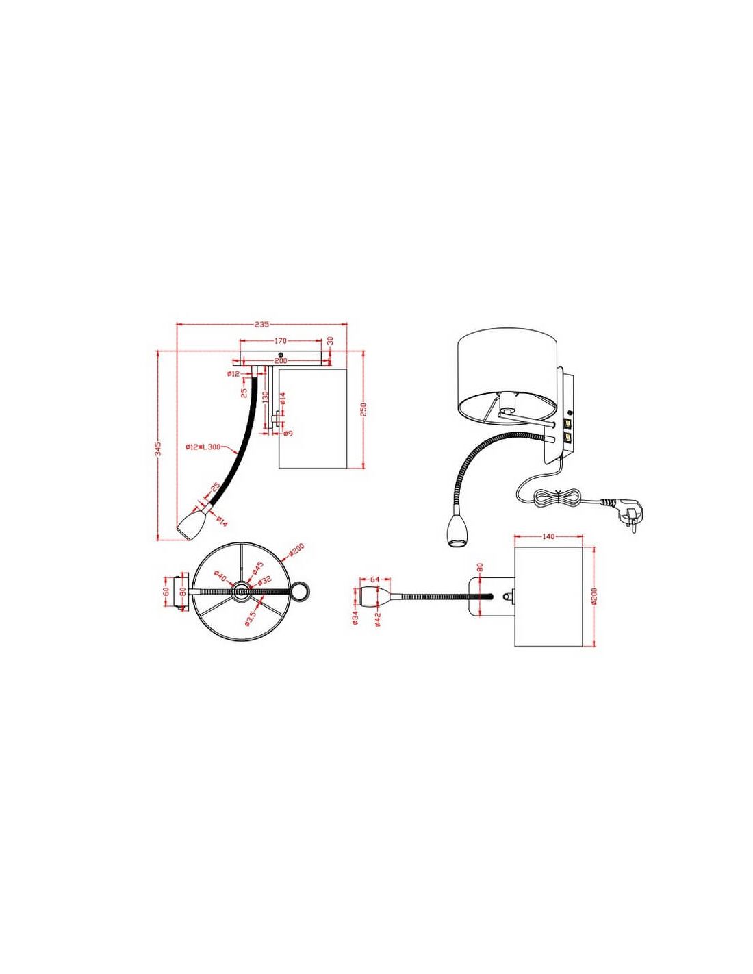 A luminária de parede Hotel funciona com 1 lâmpada base E14 de 40W de potência (não incluída na embalagem) e 1 lâmpada LED SMD - incluída - de 3,1W de potência e com fluxo de 310 lúmens, que fornece 3.000K para desfrutar de luz branca quente.
