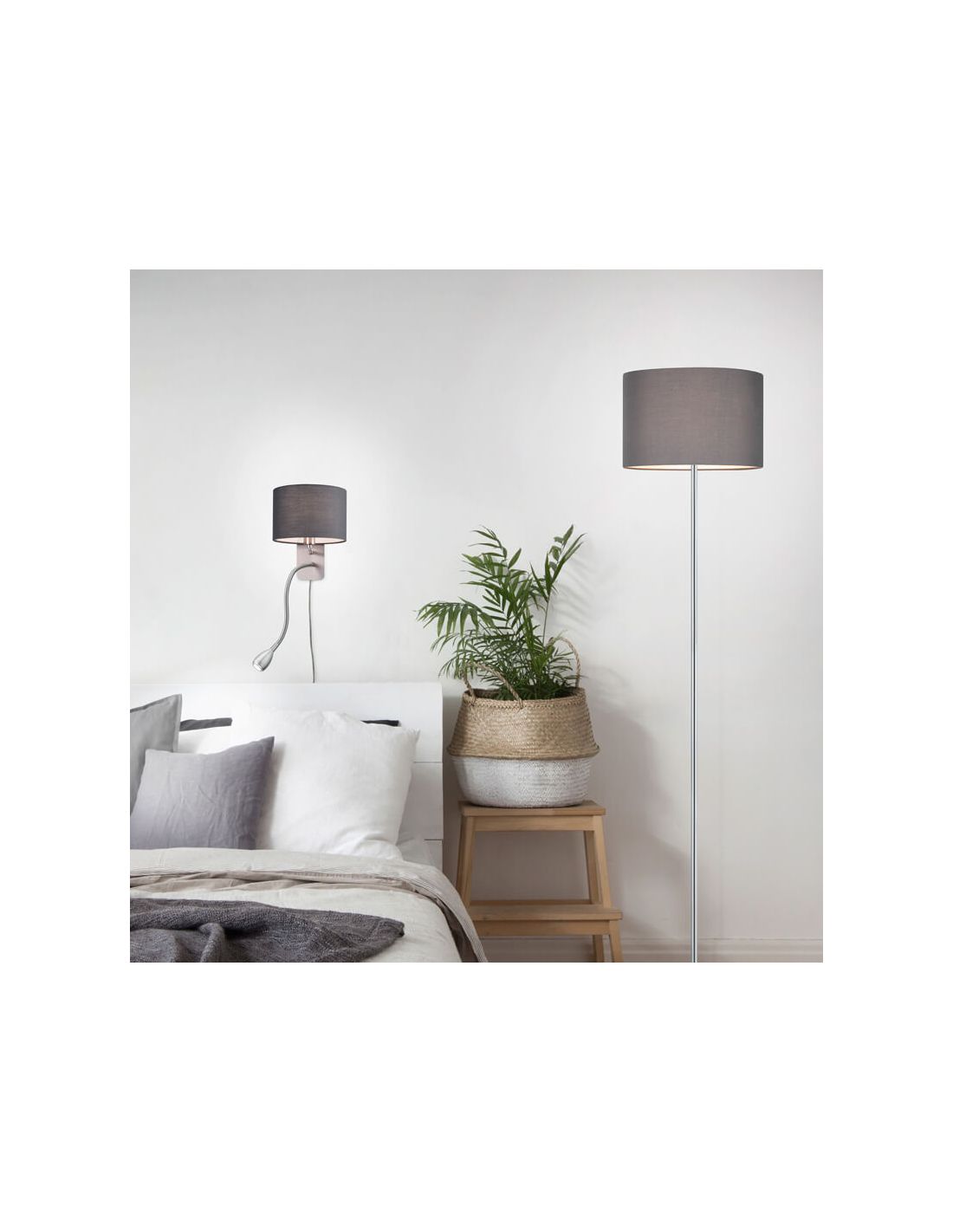 O aplique Hotel é uma proposta de iluminação decorativa que funde conceitos clássicos e modernos e está disponível com difusor em tecido nas cores cinza, branco ou preto, sempre a partir de um corpo em metal níquel fosco . Tem dimensões de 20 cm de largura e 23 cm de altura.