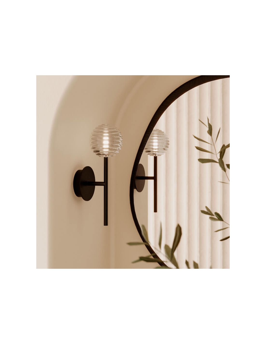 Feito de materiais de alta qualidade, como aço em preto fosco ou ouro antigo, e um abajur redondo de vidro listrado transparente, o aplique DOUL redefine a iluminação de parede.