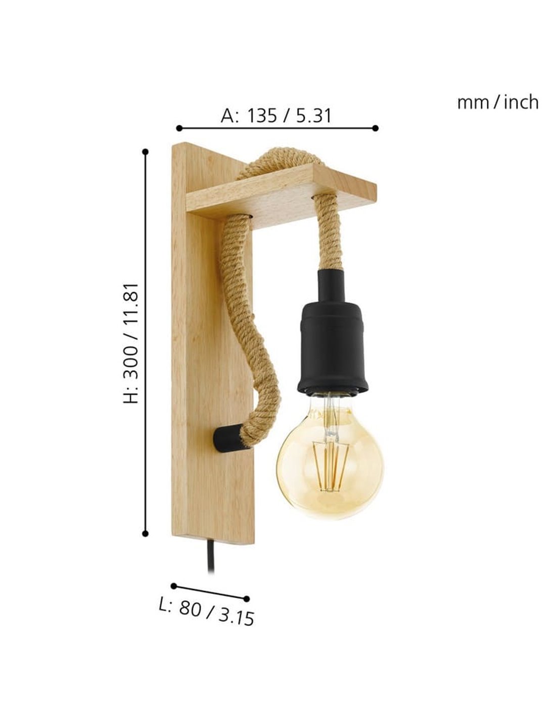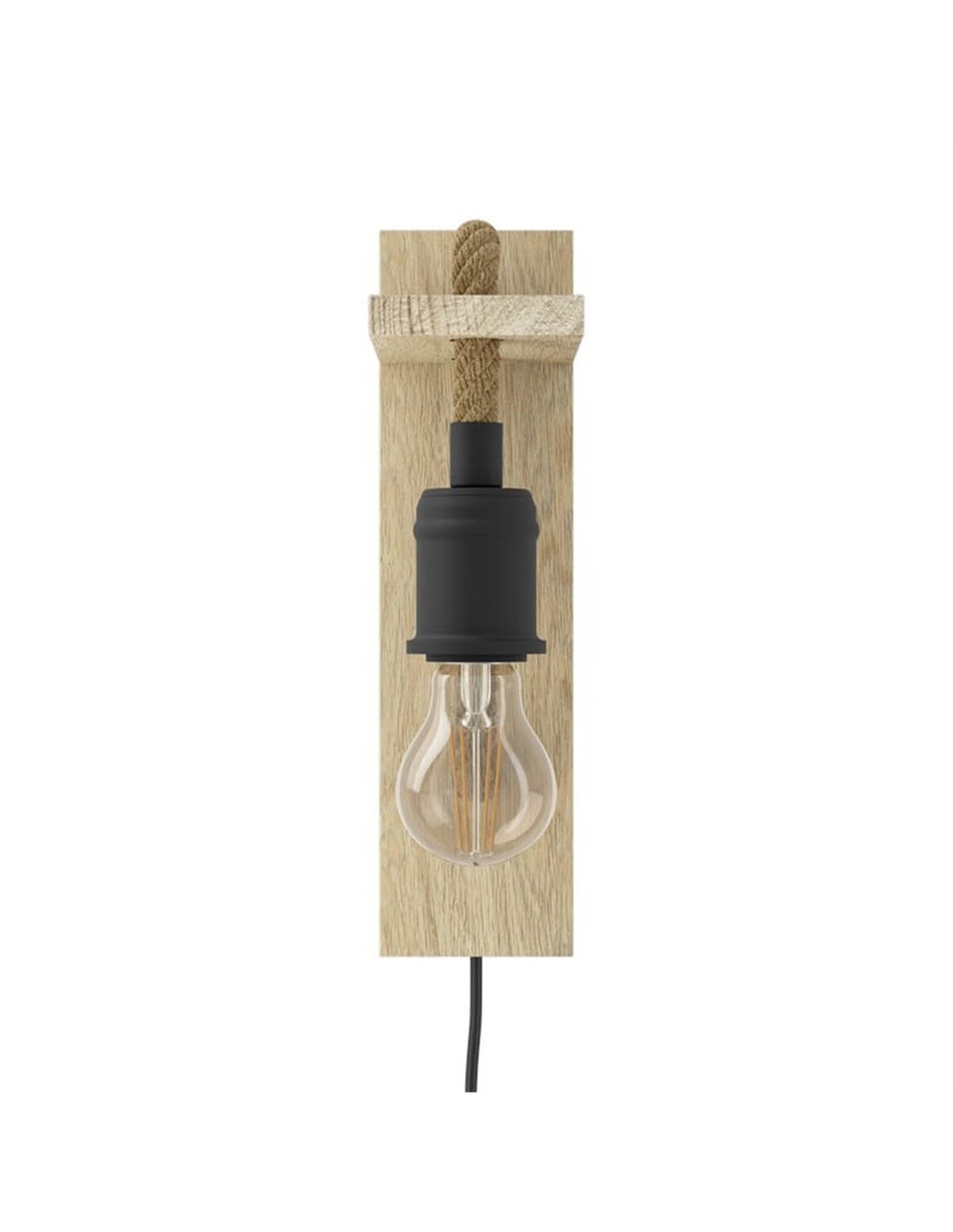 Aplique RAMPSIDE da Eglo, com corda de cânhamo e madeira de borracha e casquilho em metal preto. Compatível com lâmpadas E27 (não incluídas). Ideal para adicionar um toque vintage a qualquer ambiente.