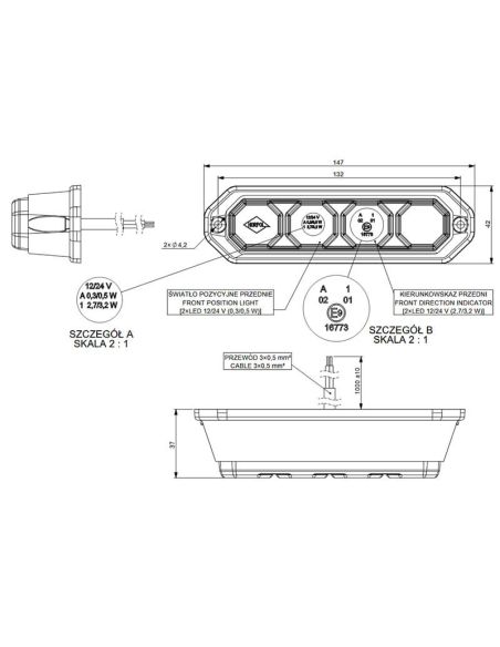 Farol de LED tipo barra LZD 2265 , 2 funções (posição e indicador), 4 LEDs, lente transparente, aprovação A1 e R10, à prova d'água IP68, 12/24 V. Compacto, universal, durável e pronto para veículos agrícolas, reboques e máquinas.