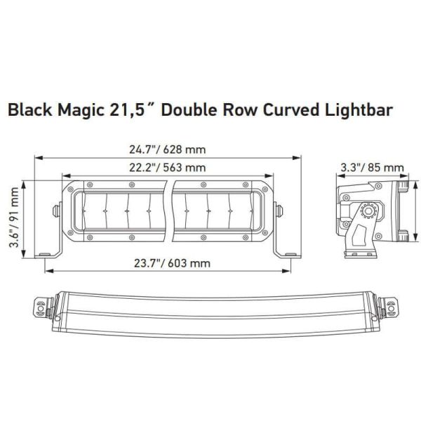 Barra de LED curva de 21,5" da série Hella Black Magic , esta barra de LED possui uma linha de 42 LEDs de alta potência que oferece uma intensidade de luz de 5.880Lm com um consumo de 91W , é aprovado pela ECE-E149 e EMC R10 e CEPE 45. São válidos para 12V e 24V e o feixe de luz é combo, combina luz de longo alcance com luz de trabalho.
