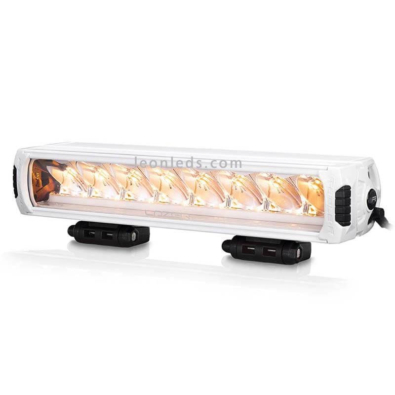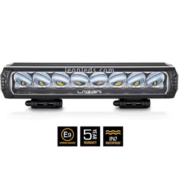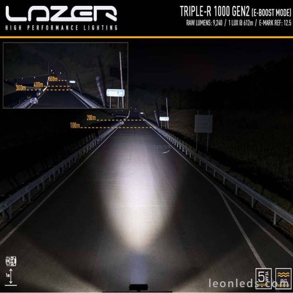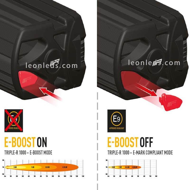 Triplo R 1000 Gen 2 LED bar da marca Lazer com luz de posição, esta nova barra de LED apresenta a tecnologia E-Boost que permite oferecer a esta barra de LED uma potência de 88W, uma intensidade de luz de 9.240Lm e 0,25Lx para mais de 1220 metros de distância (Com o conector e não iria atender o E9), se remover este conector o poder oferecido por esta barra de LED é 17,6W, uma intensidade de luz de 1.848Lm e mais Está disponível em preto e branco, selecione o que você gosta. Pode complementá-la com interface CAN e acessórios CAN sem contacto.