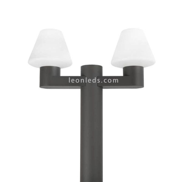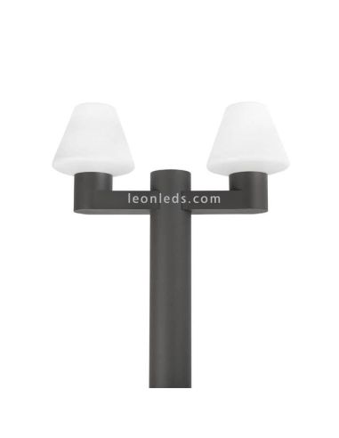 Poste de jardim Faro Barcelona Mistu com 2 braços para instalação de 2 lâmpadas LED com rosca E27 (não incluídas) em alumínio cinzento escuro de alta qualidade e difusor de luz em PMMA resistente para o interior, tem classificação IP44 e é Instalado em terreno exterior com 4 parafusos, inclui buchas, parafusos e manual de instruções.