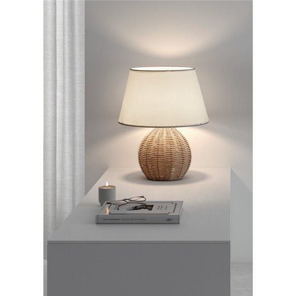 O abajur NAIROBI da MDC é uma peça decorativa que traz aconchego e estilo natural a qualquer espaço. Seu corpo esférico de vime trançado lhe dá um toque artesanal, enquanto seu abajur branco suaviza a luz para uma iluminação aconchegante.