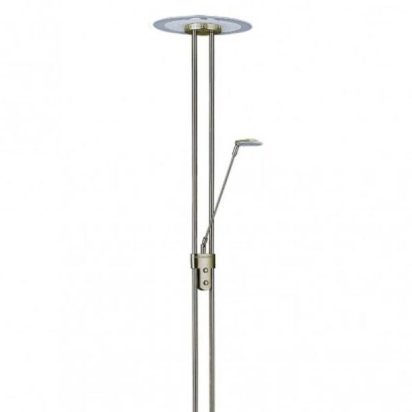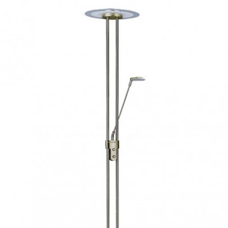 Lâmpada de pé LED com luz natural com uma potência de 5W e uma intensidade de luz de 500Lm no braço de leitura, a luz é orientada, na luz superior o poder é 18W e a intensidade da luz é 1800Lm, ambos com um tom de luz natural 4000K. Esta lâmpada de pé LED tem um acabamento de cor de couro, a base de fixação é redonda e a lâmpada é composta por duas hastes redondas em que a luz superior, o braço de leitura e os interruptores ligar e desligar são anexados.
