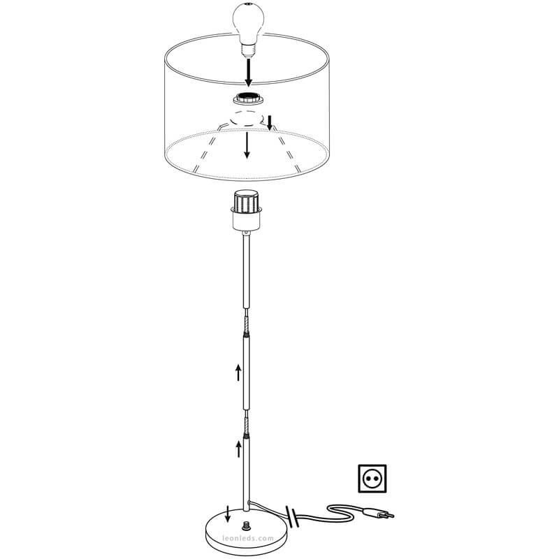 Lâmpada de pé com tela têxtil e acabamento preto total, você precisa de 1 lâmpada LED com fio largo E27 (não incluído) recomendamos instalá-lo com um tom de luz quente e uma potência equivalente entre 10w e 15W em LED. inclui botão de pedal para ativar a lâmpada e inclui 1,8 metros de cabo.
