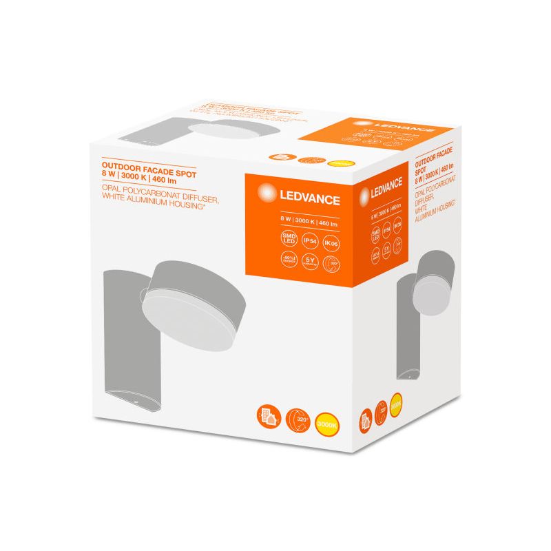 Aplique LED rotativo branco para exteriores da marca LedVance Facade Spot, em acabamento Branco com potência de 8W , tom de luz quente de 3000k e intensidade luminosa de 440LM, grau de proteção IP54 e grau de proteção contra impactos de IK06.