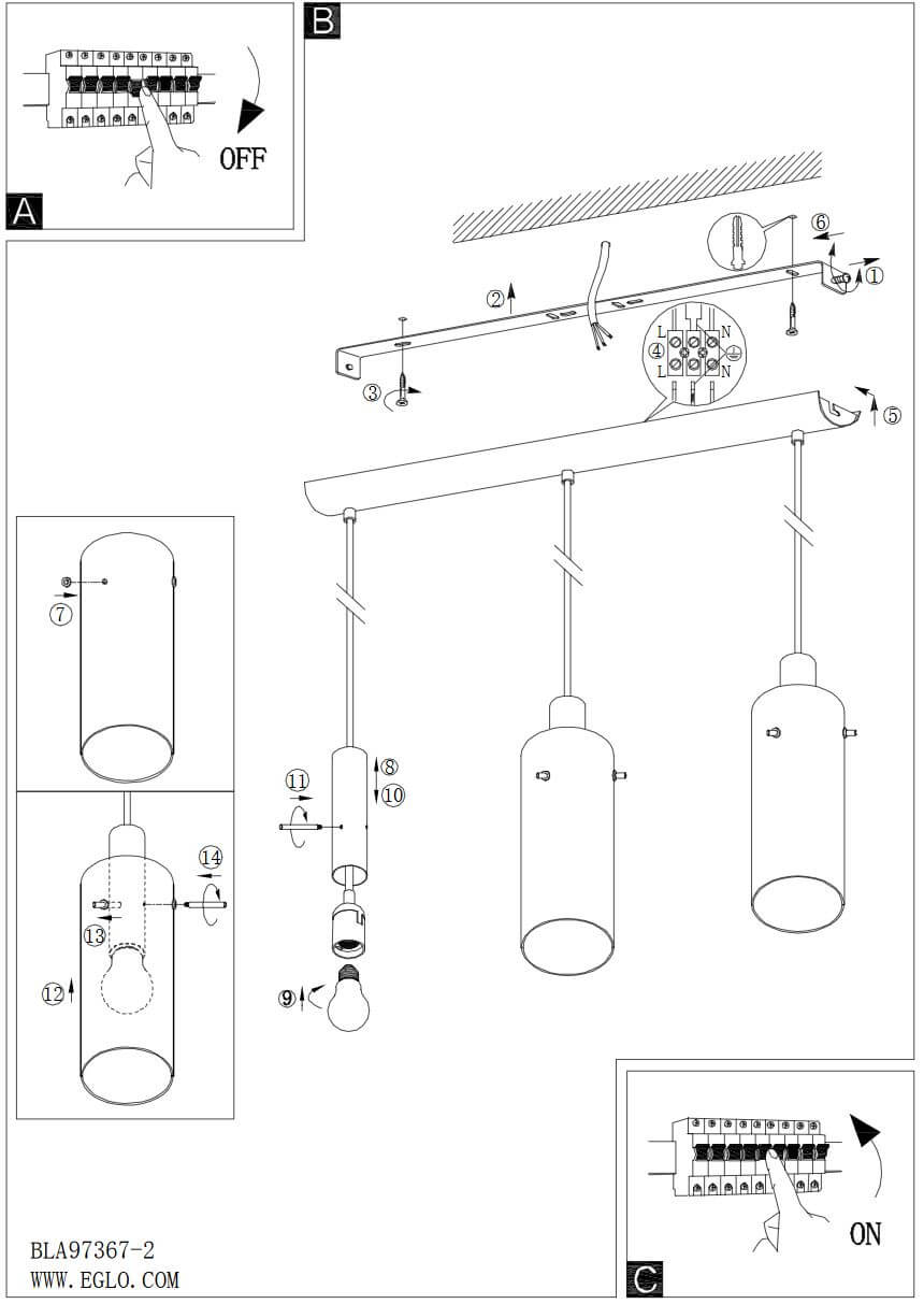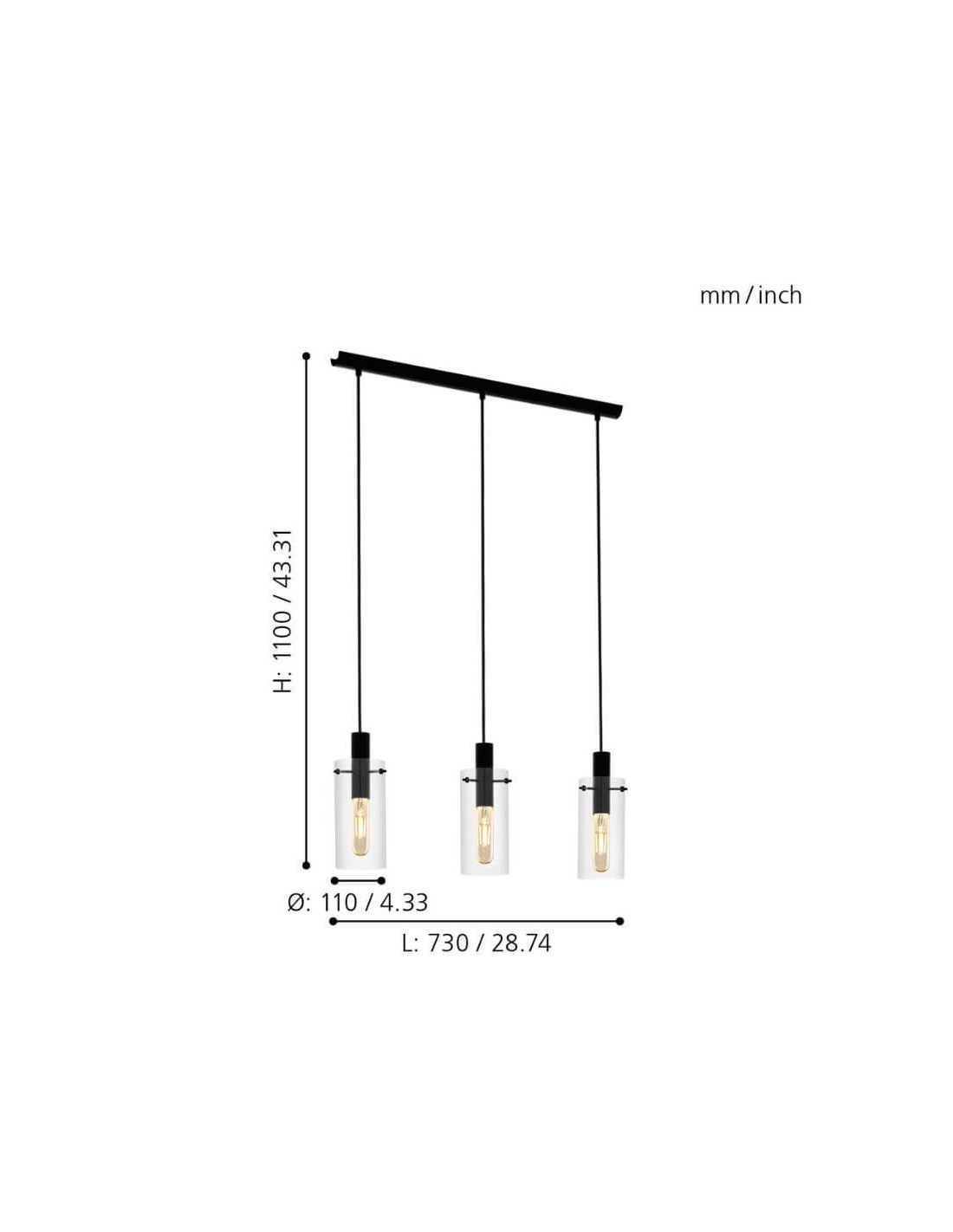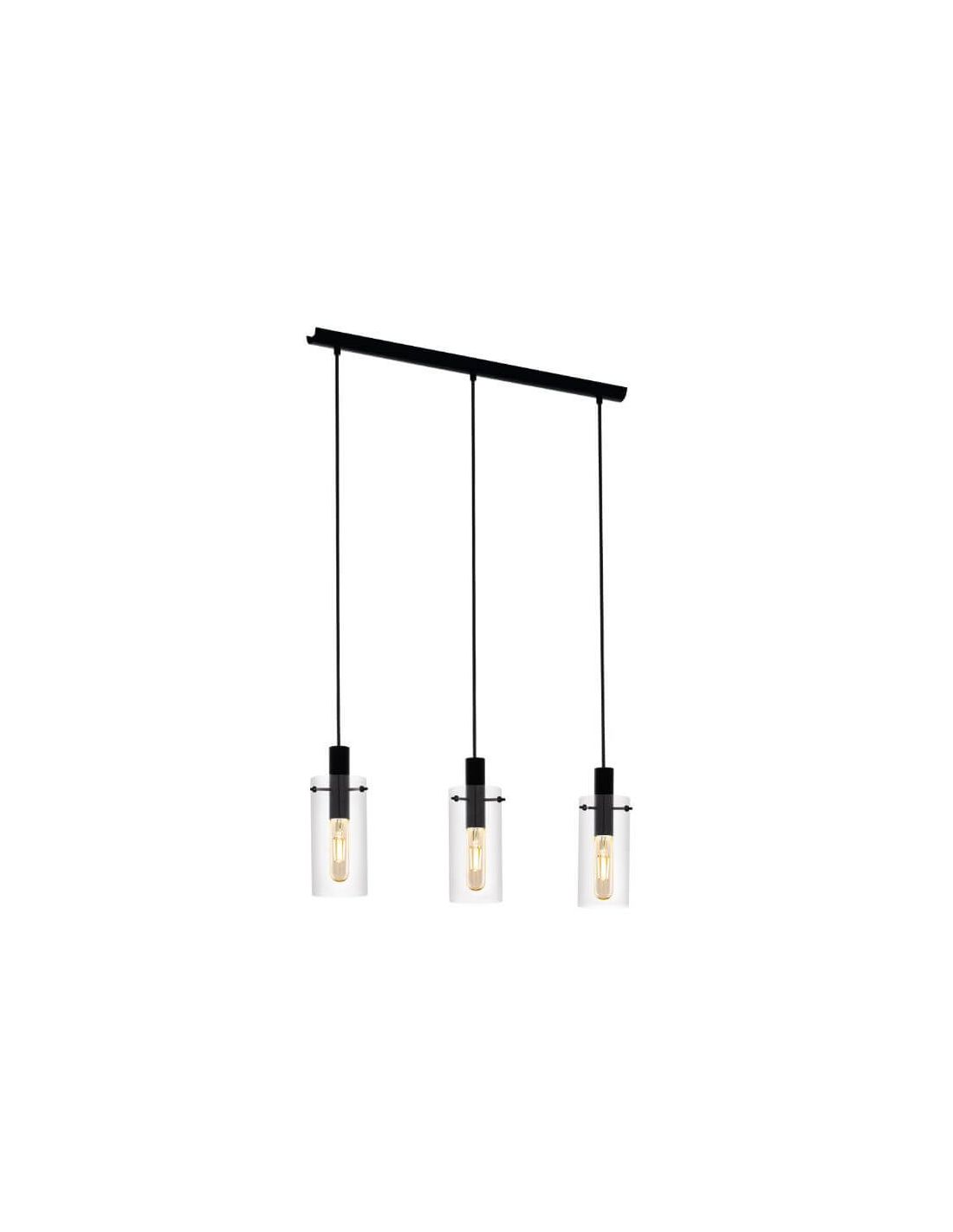 Suspensão de teto de estilo clássico moderno com 3 tons de vidro cilíndrico transparente da Coleção Montefino da Eglo Lighting. Esta luz pendente requer 3 lâmpadas E27 (não incluídas). Tem uma altura em suas 3 telas de 110 cm. Inclui manual de instruções de montagem e buchas e parafusos para instalação. Recomenda-se a sua instalação em interiores (proteção IP20).