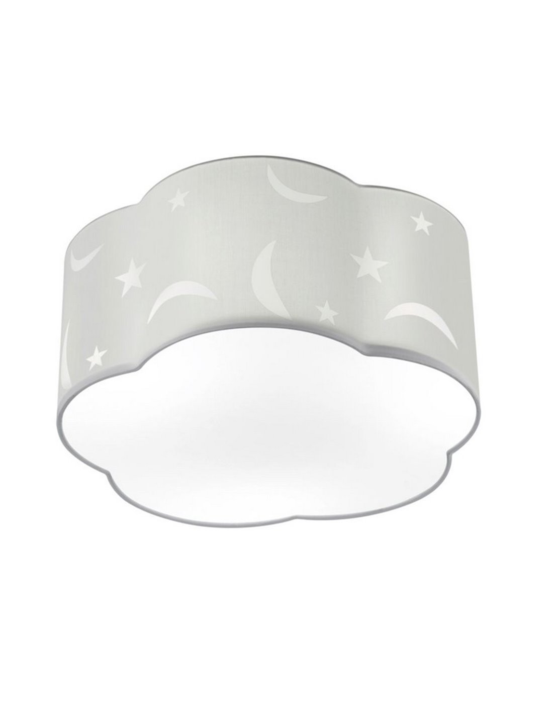 Candeeiro de tecto grande para criança estrelas e luas com abajur de 40 cm de diâmetro que permite instalar 3 lâmpadas LED com rosca E27 e difusor de luz inferior.