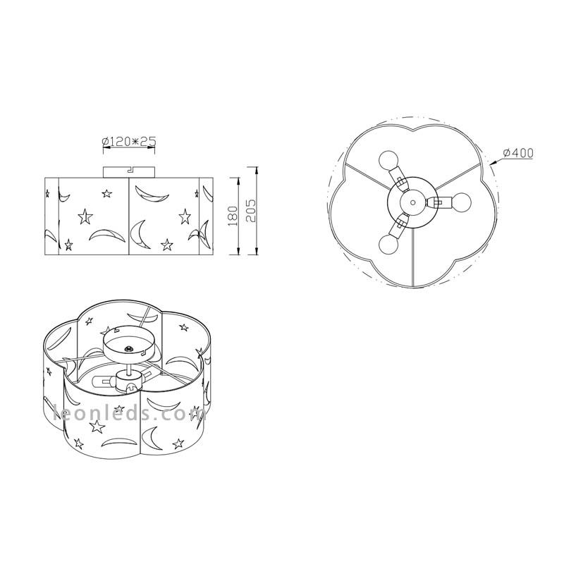 Este Plafon de teto grande lua e estrela Tem uma tela com um diâmetro de 40Cm com estrelas e luas e com um difusor na parte inferior e 3 tampas para instalar 3 lâmpadas LED com rosca E27 (Rosca Gorda). Podemos ver as dimensões em uma das fotos.