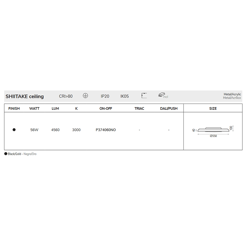 É a candeeiro de teto circular de metal. A sua estrutura preta é combinada com detalhes dourados que lhe dão aquele toque glamoroso e sofisticado. No interior está o LED integrado que dá a esta luz de teto uma saída de luz de 56W e 4560Lm. Esta potência, combinada com a sua temperatura de cor branca quente de 3000K, faz deste tecto o elemento de iluminação de que necessita em sua casa.