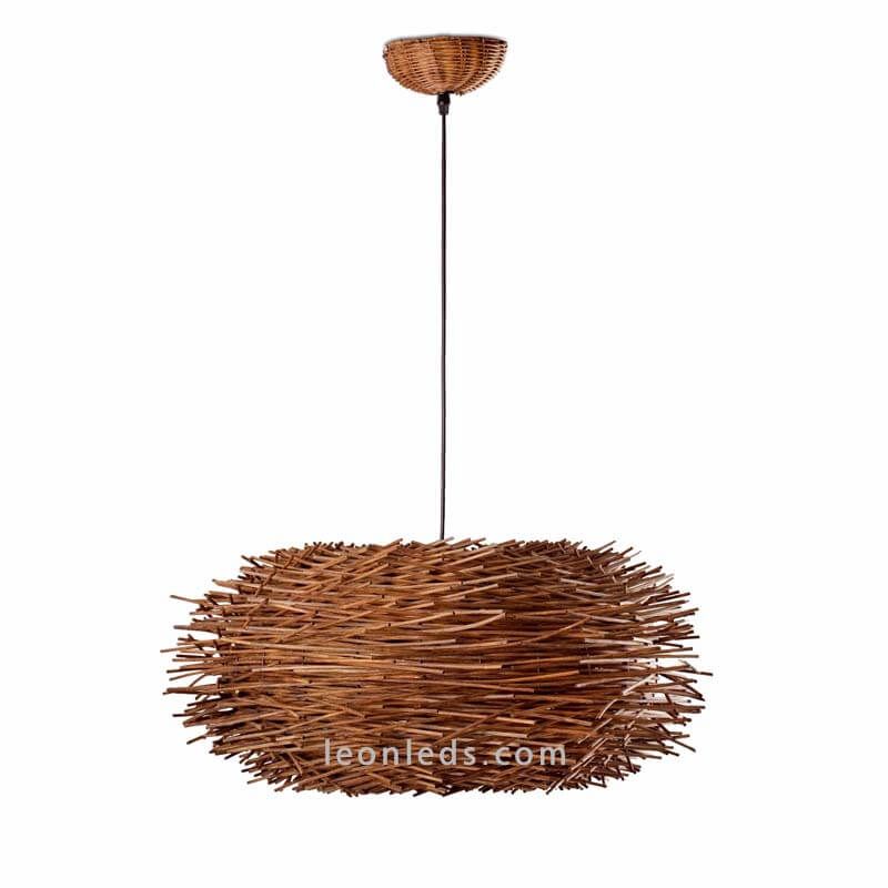 Lâmpada de teto Brown do Seri Nido com uma base do teto redondo marrom e um diâmetro de 8cm. A lâmpada tem uma altura ajustável máxima de 150Cm que pode ser regulada até 30Cm. A tela que simula um ninho de aves tem um diâmetro de 60Cm e uma altura de 29cm.