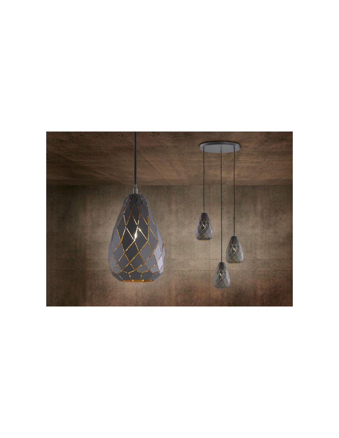 O exterior do candeeiro tem acabamento numa elegante cor antracite, enquanto o interior dourado proporciona um efeito de iluminação quente e agradável. Esta combinação de cores faz do ONYX uma peça central marcante em qualquer ambiente, acrescentando um toque de luxo e modernidade.