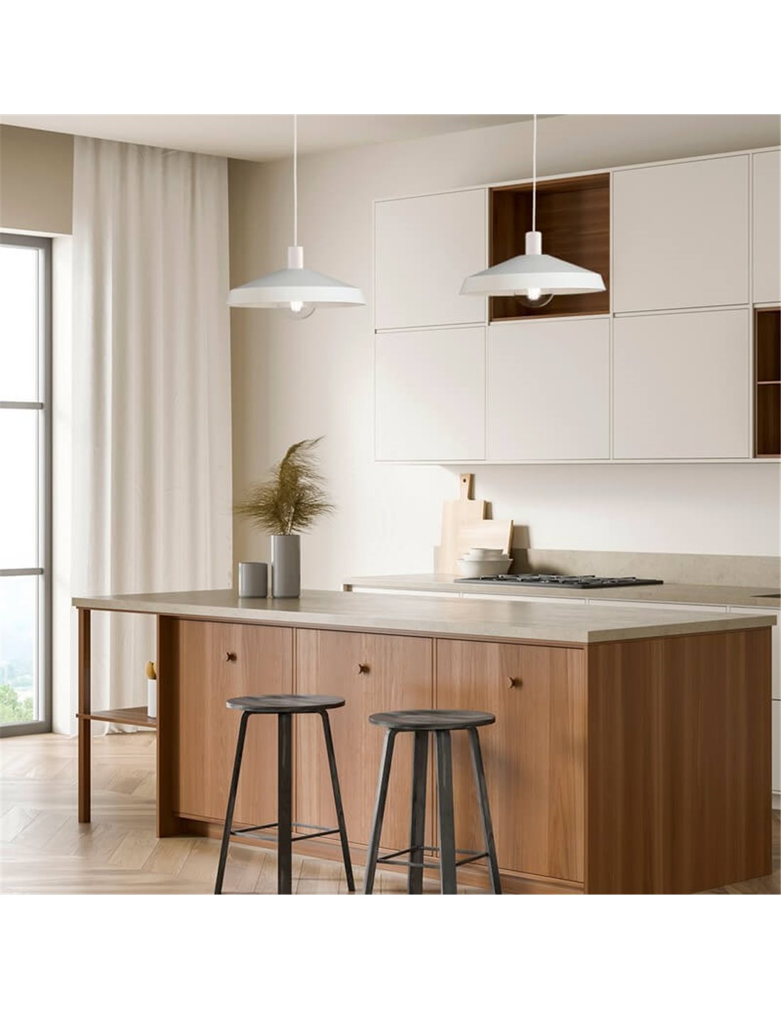 O candeeiro suspenso de teto EVELYN é uma adição elegante e moderna a qualquer casa ou espaço comercial. Com um diâmetro de 45cm , este candeeiro suspenso está disponível em dois acabamentos: Branco e Preto, permitindo uma adaptação perfeita a diferentes estilos de decoração.