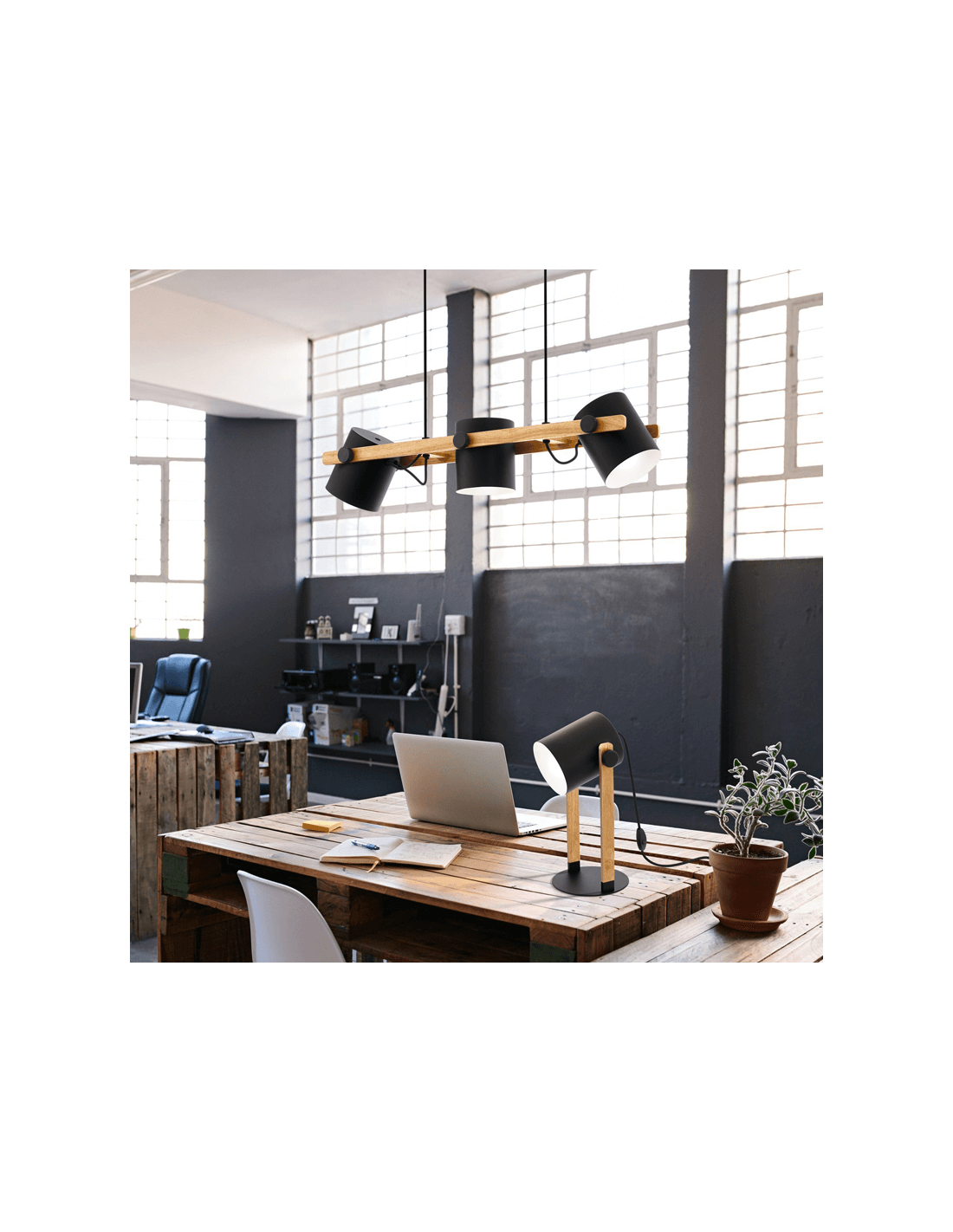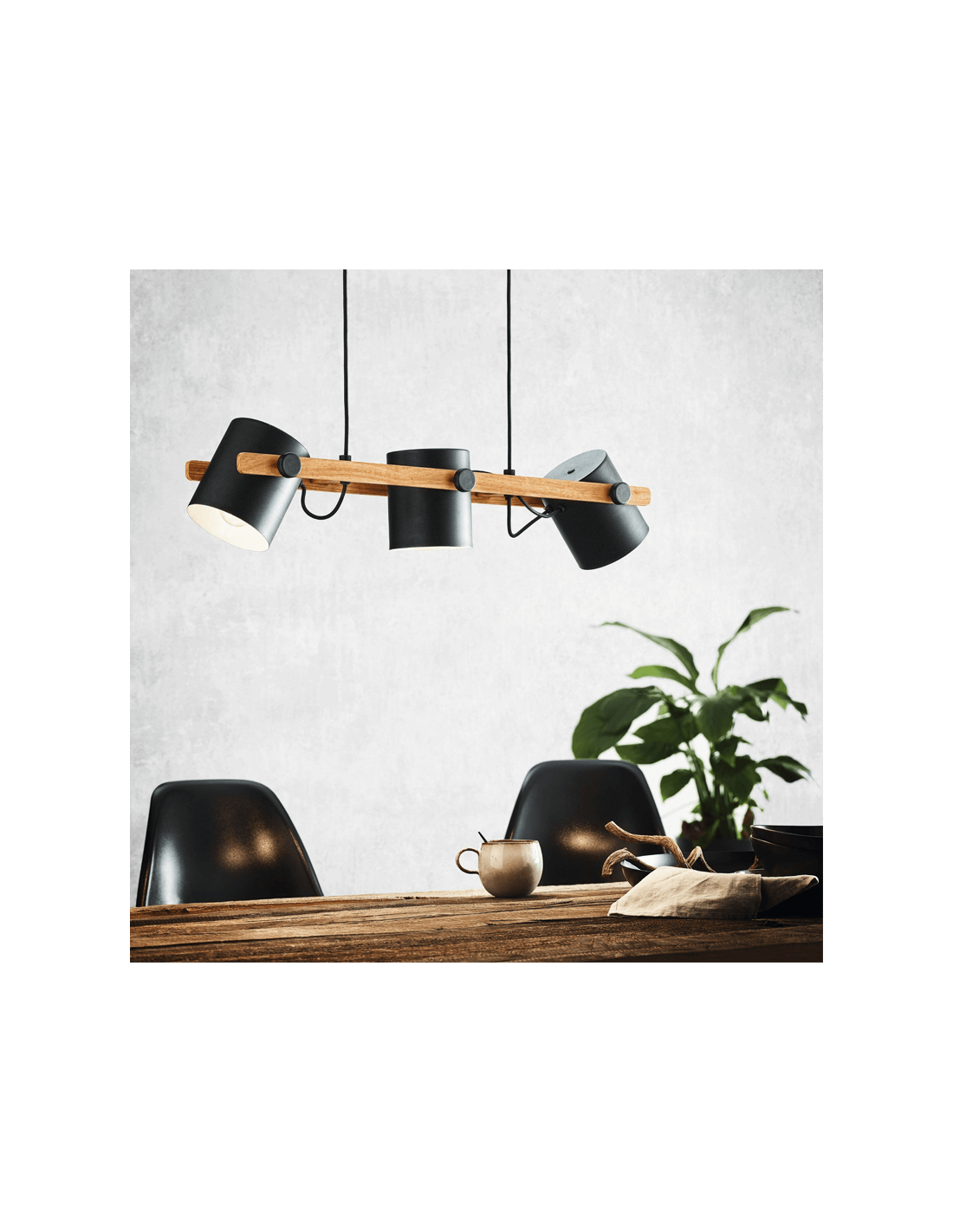 Lâmpada pingente de teto nórdica com acabamento em madeira marrom e metal preto da coleção Hornwood Iluminação do Eglo. É composto por 3 foci com telas de aço preto orientados juntando duas varas de madeira e dois cabos de suspensão preta. Ele é instalado no teto usando uma placa de metal preto. Necessidades de instalação de 3 lâmpadas com caixa E27 (não incluído) com um máximo de 60W. Você pode escolher o tom da luz que você prefere dependendo da estadia e seu tamanho.