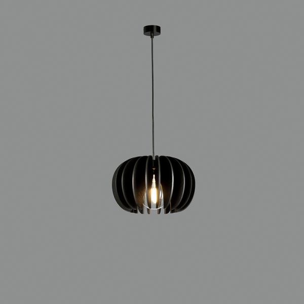 A estrutura dest candeeiro, feita de madeira preta, assemelha-se à forma de uma flor. A estrutura das pétalas permite a passagem da luz, criando um belo jogo de luz e sombra. A luz filtra através e cria um efeito de iluminação em espiral.