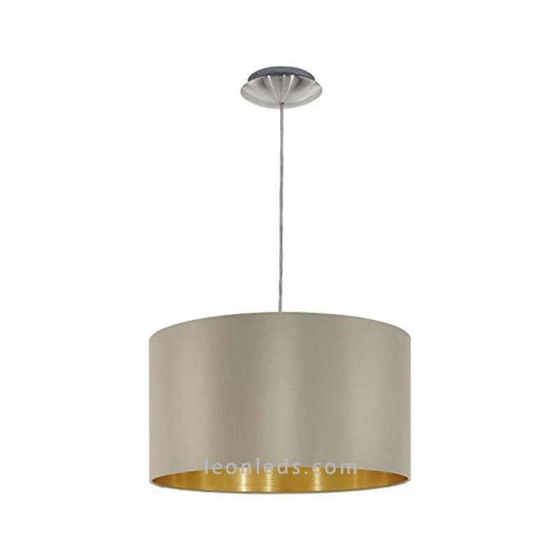 La Lâmpada de tecido moderno Cor Série Brown Maserlo tem uma tela têxtil com um diâmetro de 38Cm, marrom no exterior e dourado no interior, você precisa de 1 lâmpada LED com rosca E27 e recomendamos a instalação de 1 lâmpada LED no formato de prateleira A60. O suporte redondo que ancora no teto é cromado, pode ser regulado até uma altura máxima de 110Cm.