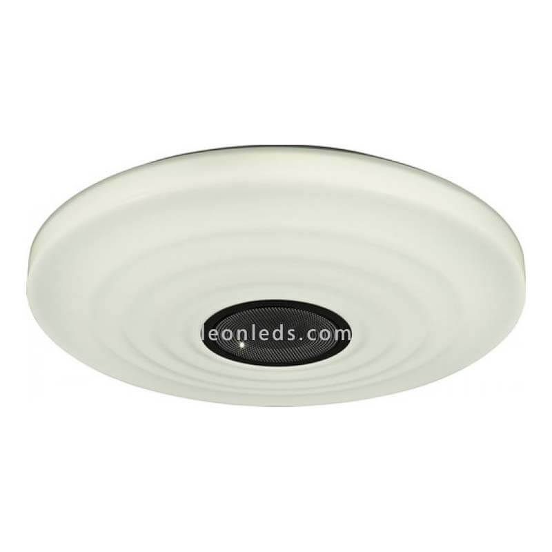 Plafon LED com alto-falante e controle remoto da coleção Ondas da Mantra Iluminación, com potência de 60W, intensidade de luz ajustável de 4.200Lm e tom de luz ajustável de 3000K Warm Light a 6500K de luz branca, tanto o tom de luz como a intensidade da luz pode ser regulada usando o controle remoto, o alto-falante pode ser conectado via bluetooth que você pode ativar com o próprio controle remoto.