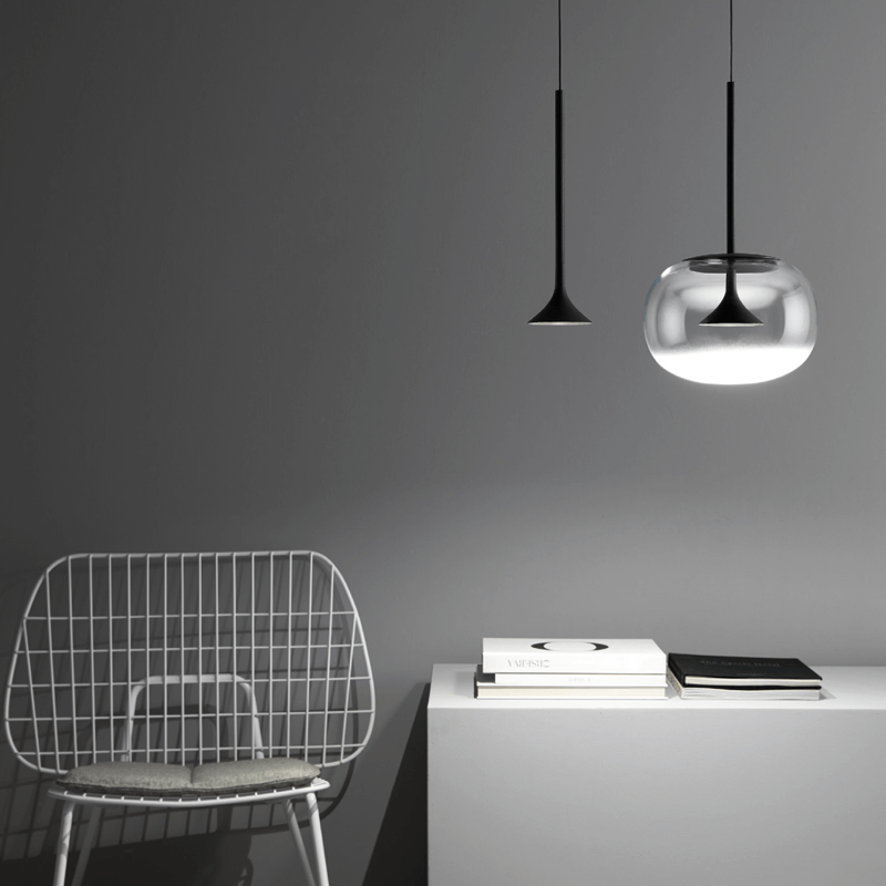 Este candeeiro suspenso preto Alive é apresentado com uma estrutura em forma de trombeta feita de aço com um acabamento escuro, que serve de suporte para o abajur PMMA.