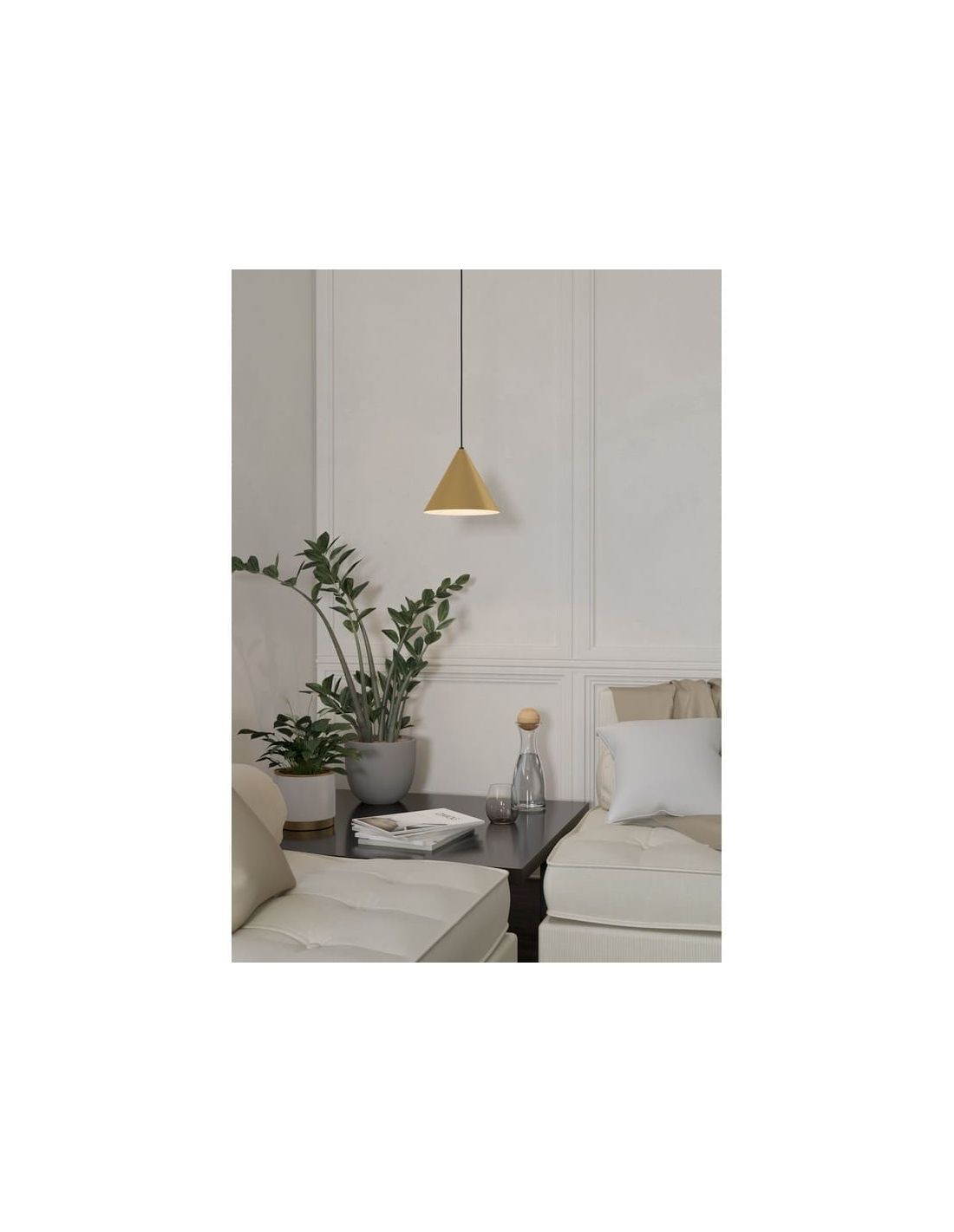 A luminária pendente Eglo NARICES 99591 combina um design minimalista da Nova Era Nórdica com materiais de alta qualidade. Sua cúpula cônica em latão escovado com interior dourado, suspensa por um cabo têxtil preto, proporciona uma luz quente e difusa que valoriza qualquer ambiente, como salas de estar e salas de jantar .