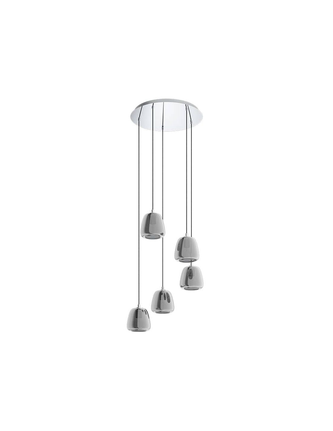Candeeiro de teto suspenso com 5 luzes de vidro em diferentes alturas, elegante e perfeito para a sua sala. Este é um candeeiro da coleção Albarino da marca Eglo Iluminación, referência em iluminação . É um candeeiro de estilo clássico e elegante perfeito para qualquer divisão que requeira uma decoração e iluminação requintada com toques de vidro e cristal. Possui 5 Luzes, sua tela é dominada por vidro preto com toques de aço preto.