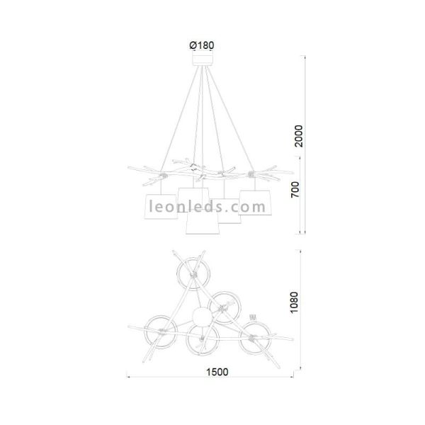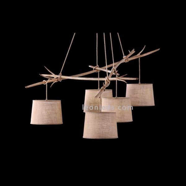 A lâmpada rústica pingente da série Sabina Mantra é composto por 5 telas de arpillera têxtil. As telas estão sujeitas a 5 fios com revestimento têxtil imitando a corda. Para dar-lhe um toque único, a partir da base do teto saem cinco cabos revestidos que possuem 4 elemetes de metal imitando galhos de madeira amarrados entre se formando um triângulo, os cabos que penduram desses elementos são aqueles que mantêm as telas restantes em diferentes alturas.