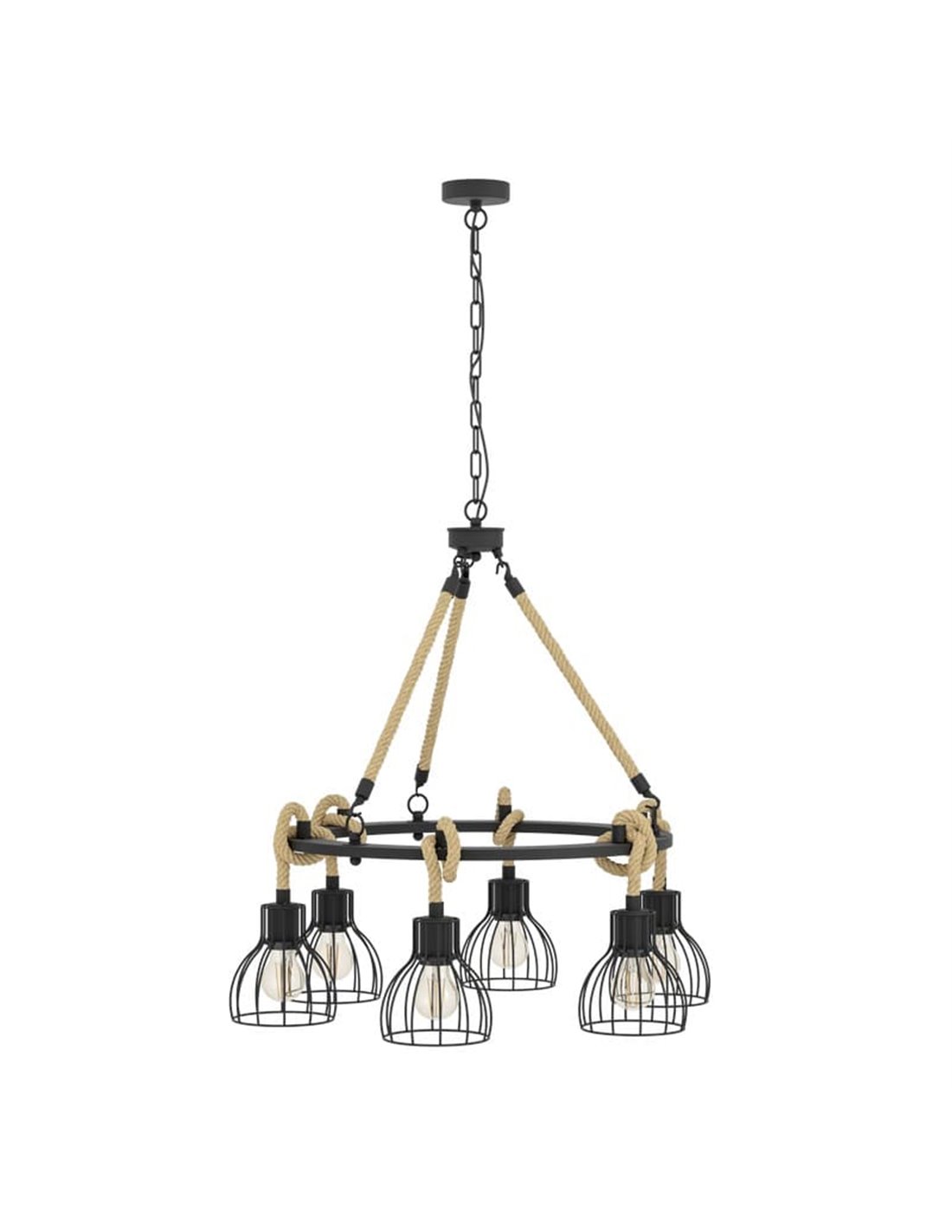Luminária pendente RAMPSIDE da Eglo, com anel de metal preto e seis cortinas de arame suspensas em cordas de cânhamo. Compatível com lâmpadas E27 (não incluídas). Perfeito para iluminar salas de estar ou de jantar com estilo vintage.