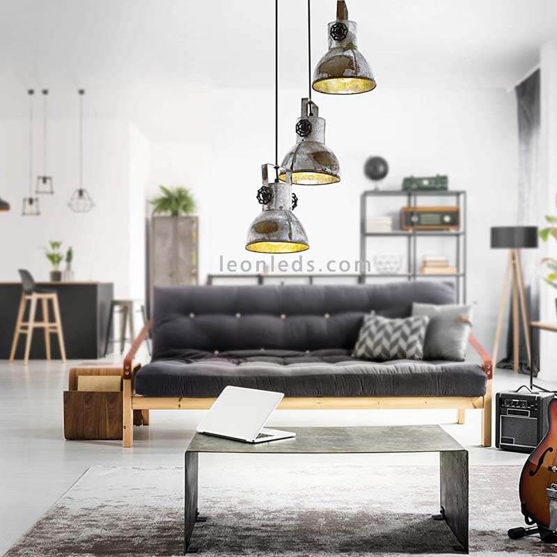 Candeeiro pendente vintage de aço e madeira com 3 lâmpadas da Eglo Iluminación, conjunto com 2 É composto por um suporte de tecto redondo em madeira e 3 focos suspensos em aço com acabamento em zinco efeito usado que lhe conferem um aspecto envelhecido .